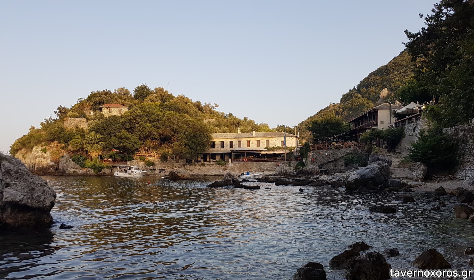 Δίπλα στην πολύ όμορφη παραλία, στο λιμανάκι όπου γυρίστηκε το Mamma Mia (και έκτοτε την πλασάρουν με τον κλασσικό μίζερο τουριστικό τρόπο). Το πρότεινε ένας ταξιδ.οδηγός, μου άρεσε και το "αντισυμβατικό" λουκ του ιδιοκτήτη, οπότε κάτσαμε.