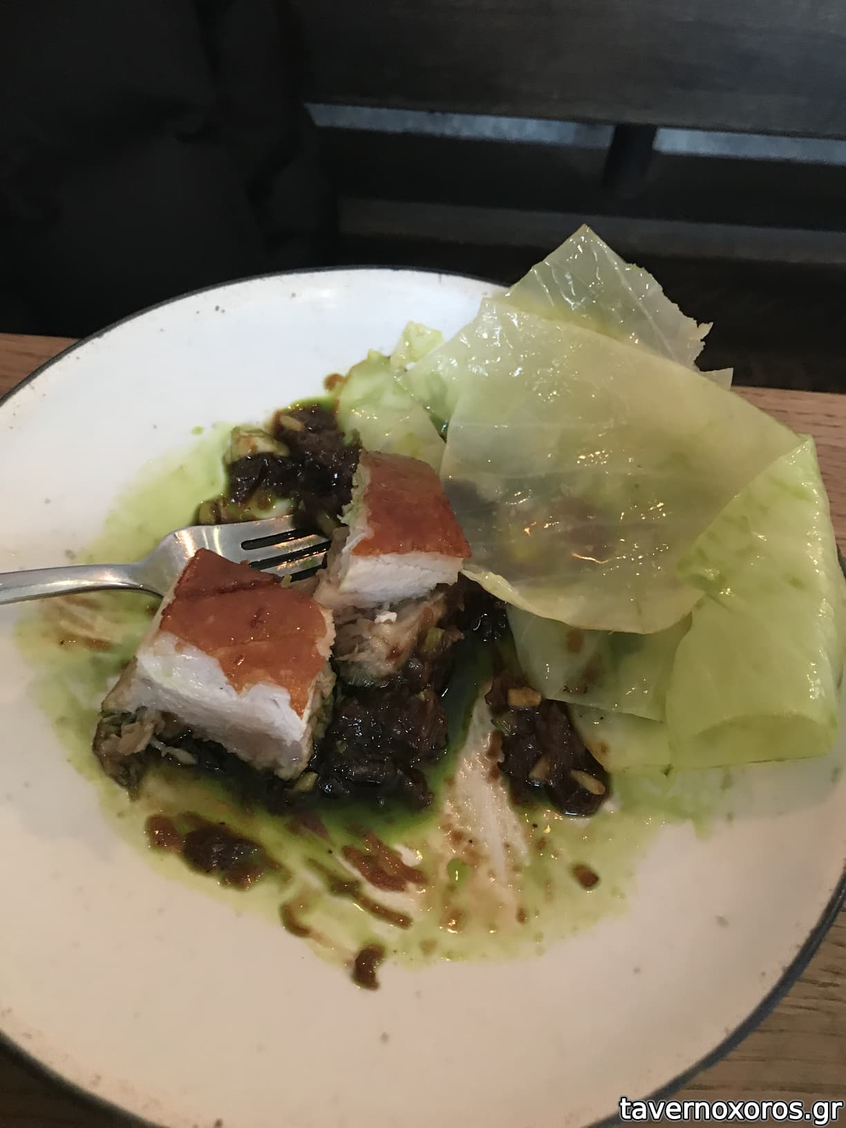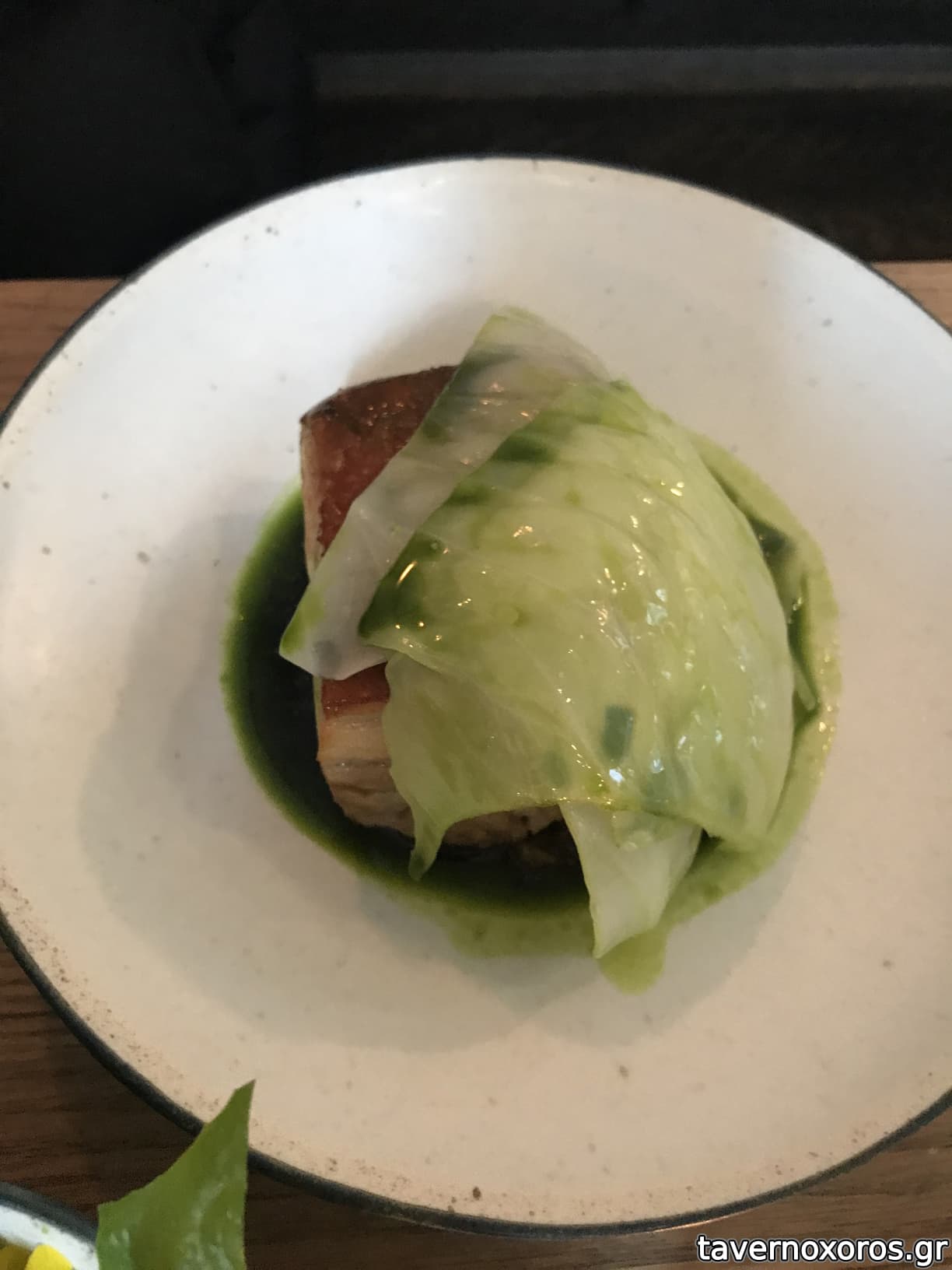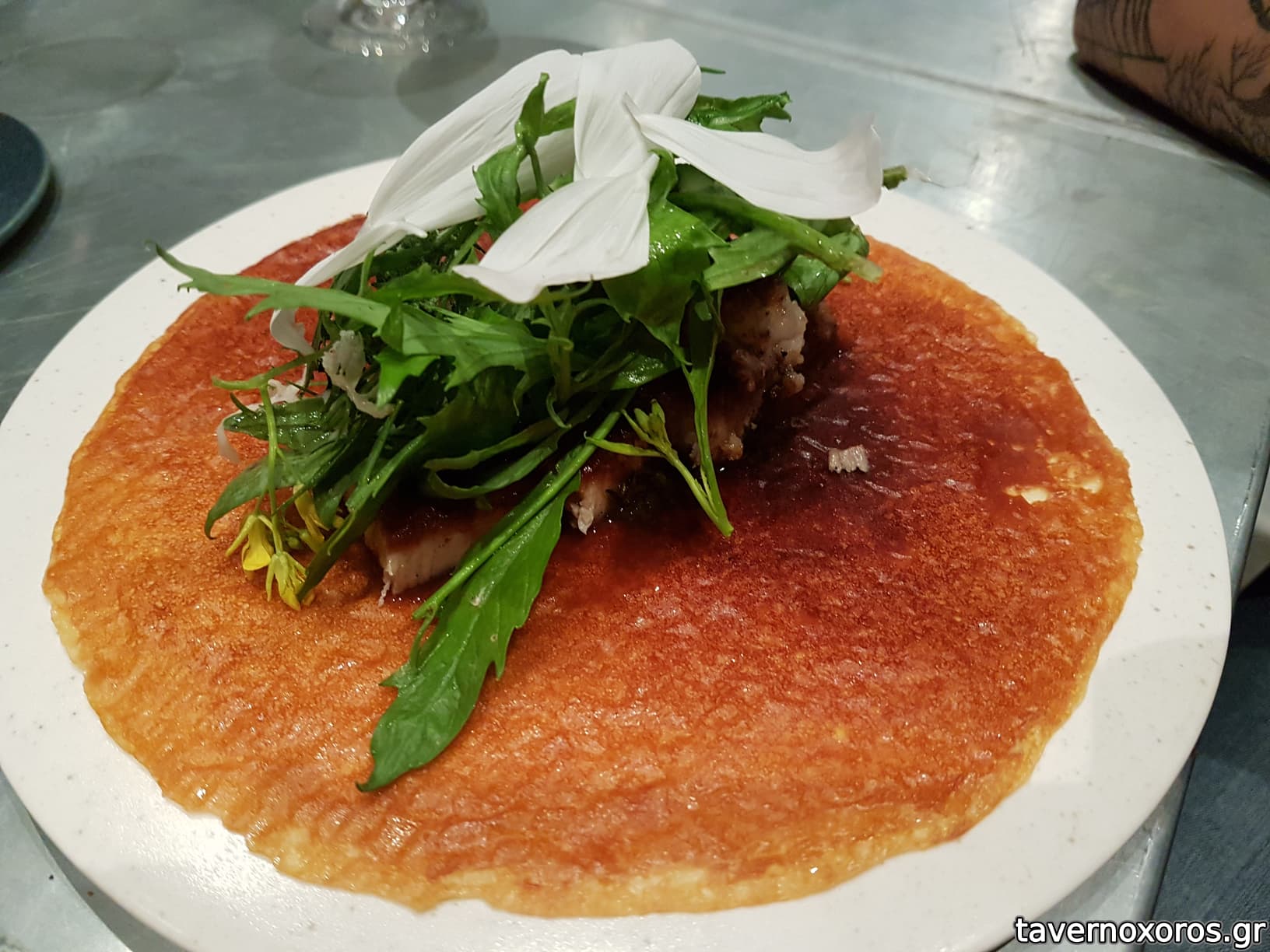 A caramelized milk skin with grilled pork belly, cress and wasabina (πολύ καλό)