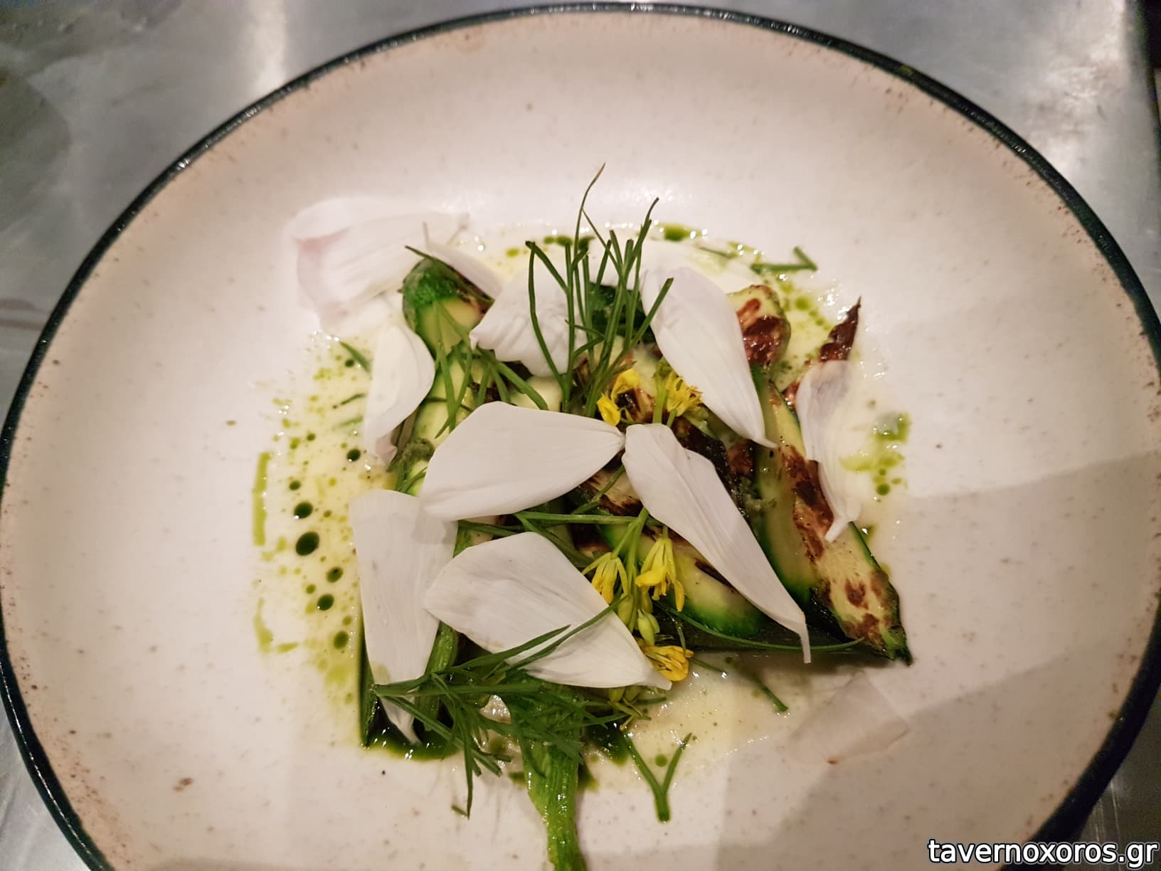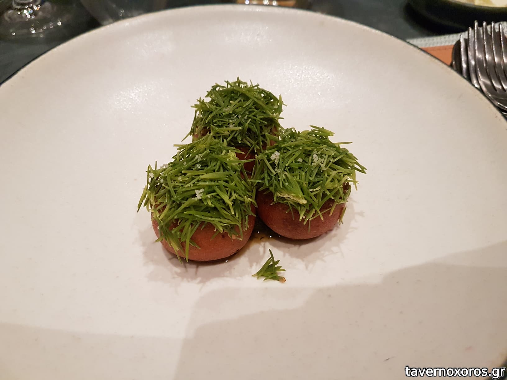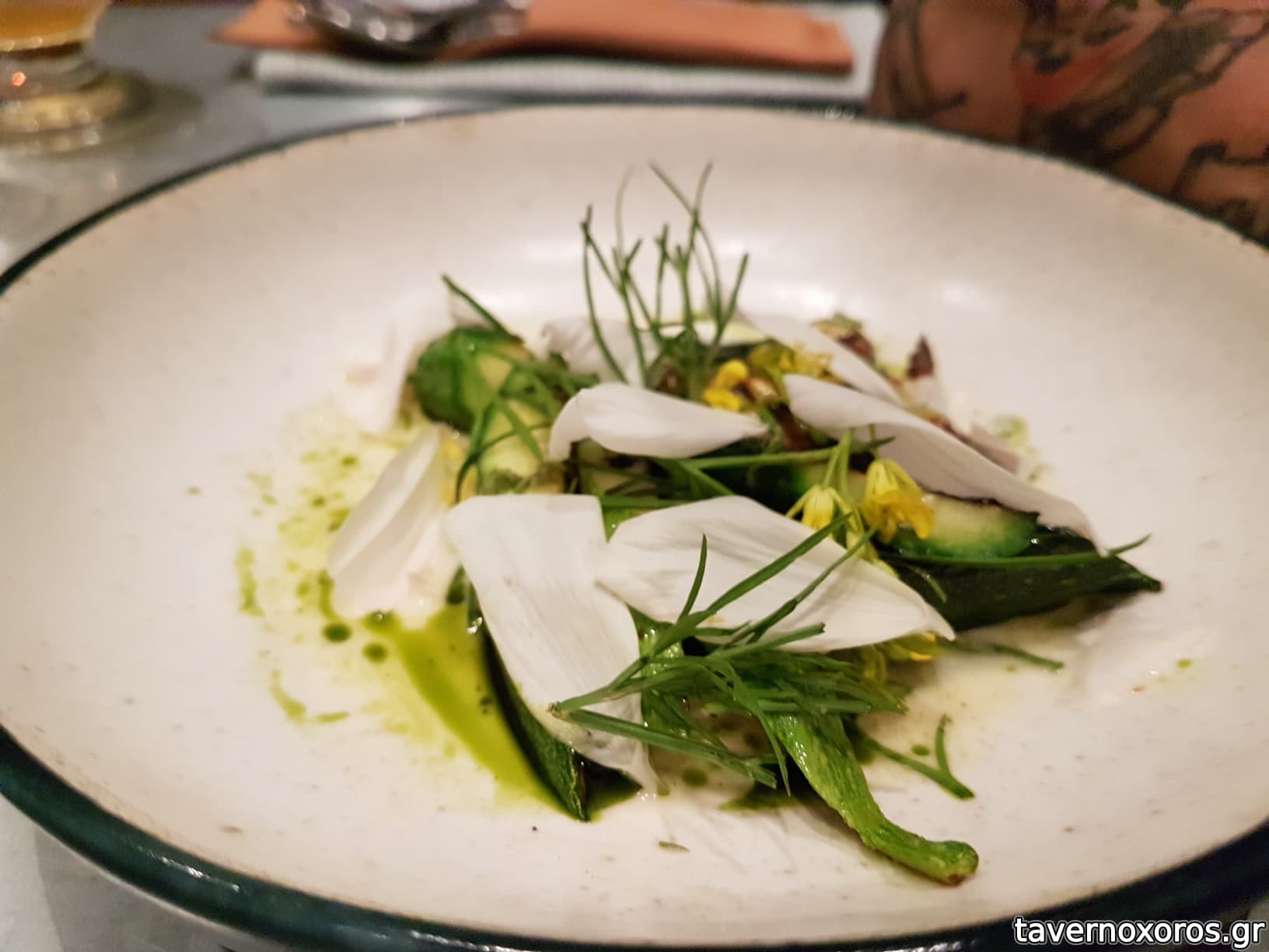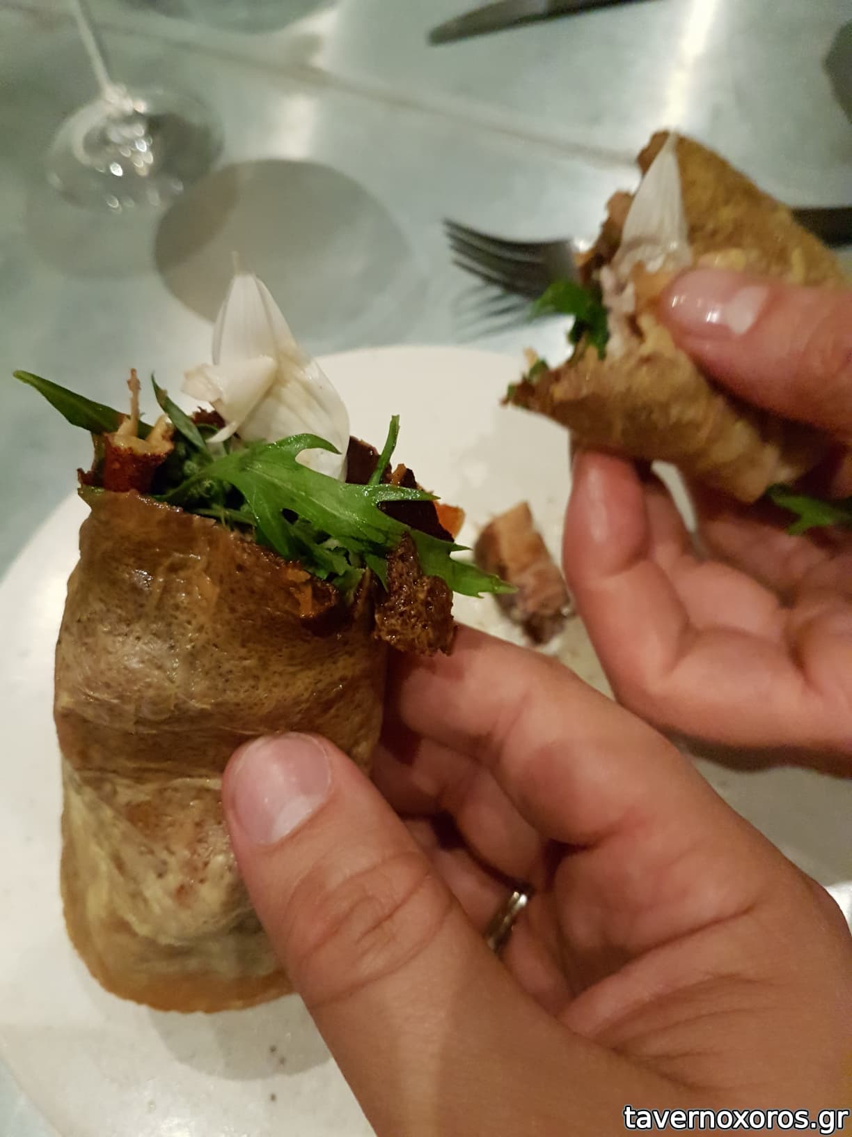 A caramelized milk skin with grilled pork belly, cress and wasabina (πολύ καλό)