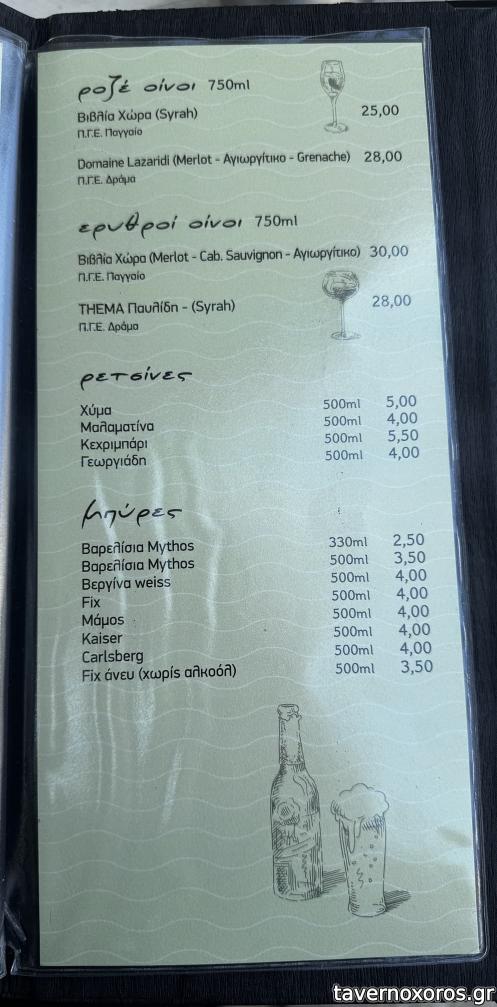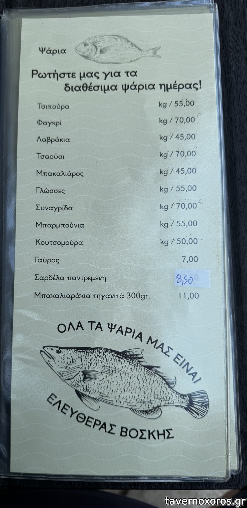 Οι τιμές που έχει ο κατάλογος πλέον έχουν αλλάξει, μερικά προς τα πάνω και μερικά προς τα κάτω. Πχ τσίπουρο με μεζέ το έχουν 10€ πλέον, ενώ Μοσχοφίλερο 12€ και Κανένας 20€ για παράδειγμα.