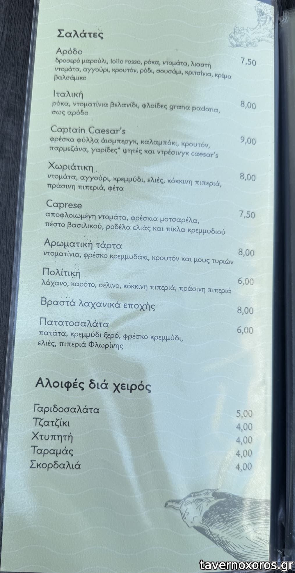 Σημείωση: Στην τελευταία επίσκεψη ενημερωθήκαμε πως ο κατάλογος αλλάζει για αυτό και αρκετά πιάτα απουσίαζαν. Έως τότε ίσχυε αυτός που έχει ανέβει από τον dokimastis. Ένα ακόμη λόγος για επίσκεψη, όταν πέσουν τα κρύα και γίνει υποφερτό το '