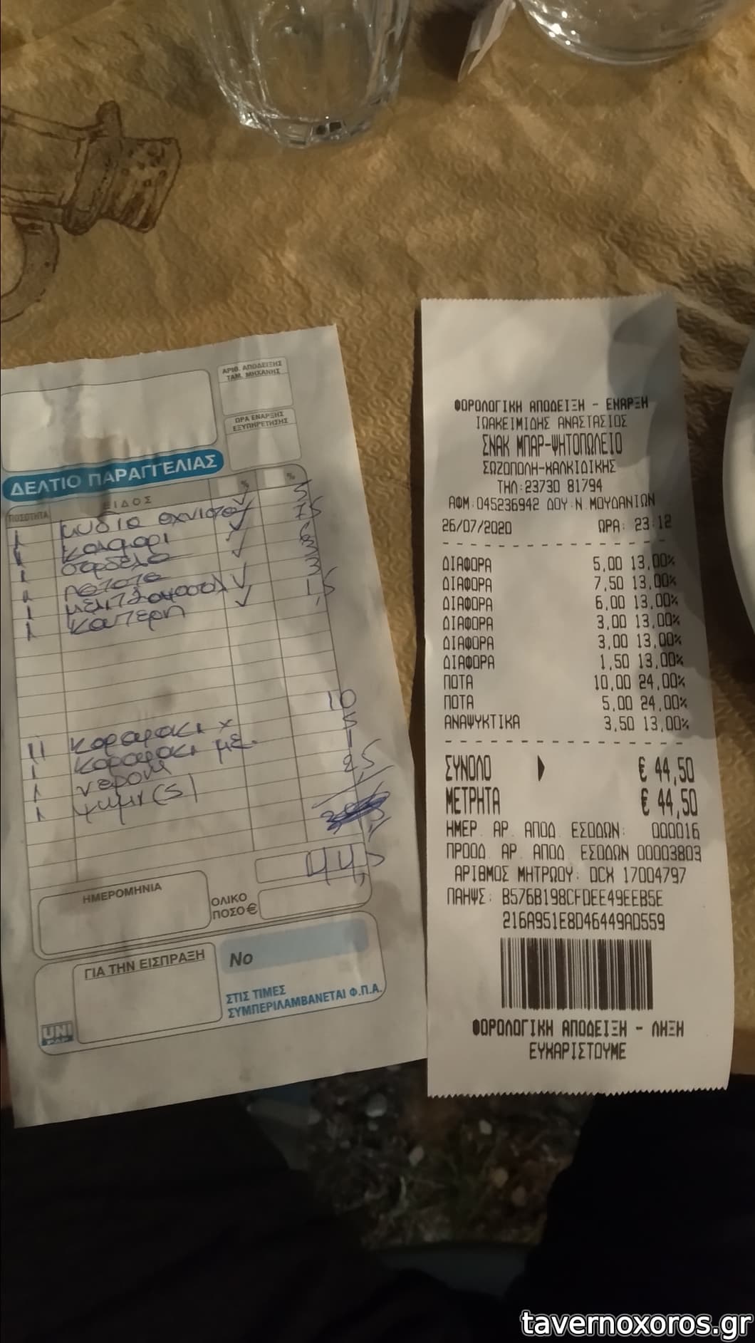 Για τα παραπάνω, μαζί με ψωμί και 2 μισόλιτρα λευκό κρασί (το ένα κερασμένο), μας βγήκε 37,