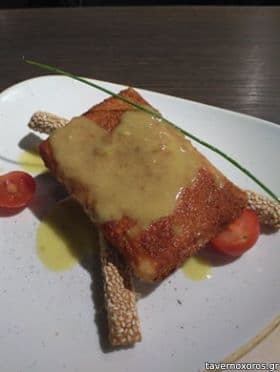 -Μενταγιον μελιτζανας. Μου αρεσαν πολυ. Παναρισμενα κομματια σαν σνιτσελ, γεμιστα με φιλαδελφια.
