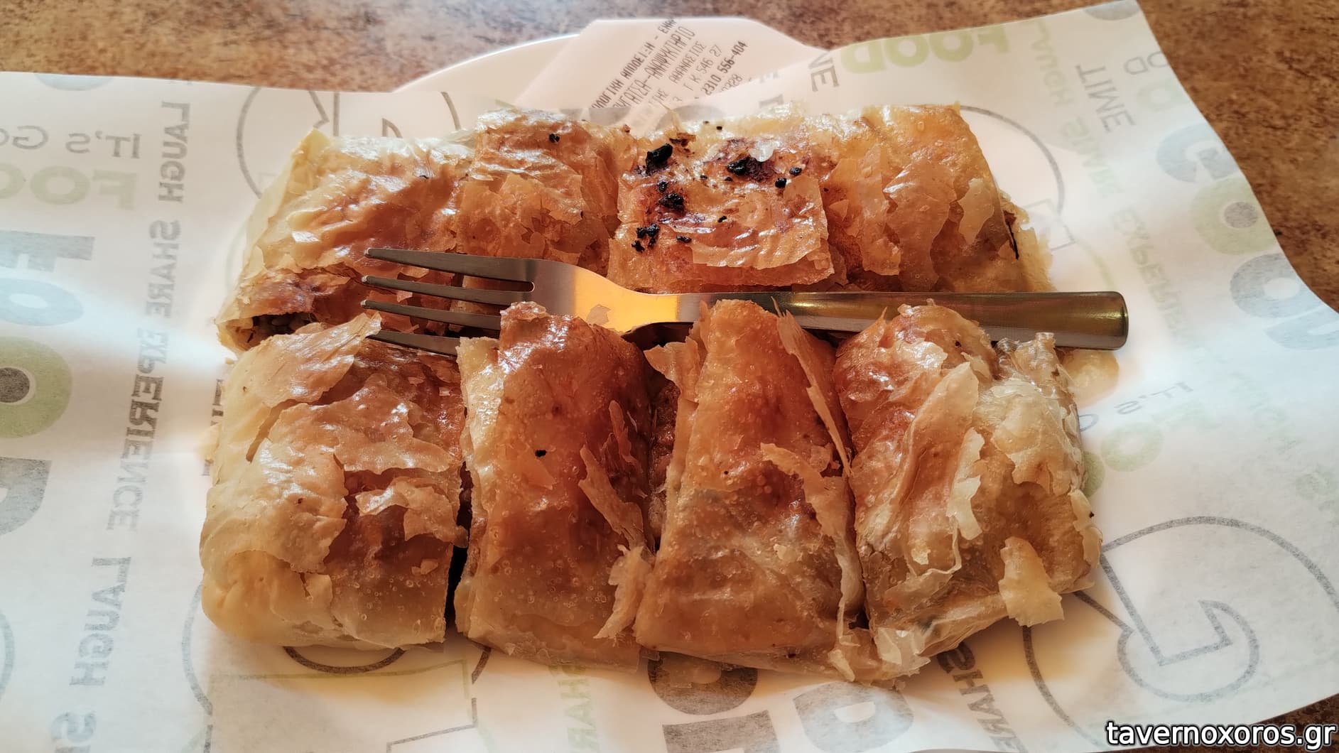 Μπουγάτσα κιμά, μάλλον τυποποιημένη, αλλά με πολύ πλούσια και μπαχαρωμένη γέμιση. Φύλλο πολύ λεπτό αλλά τραγανό. Γενικά καλή κατάσταση, 2.