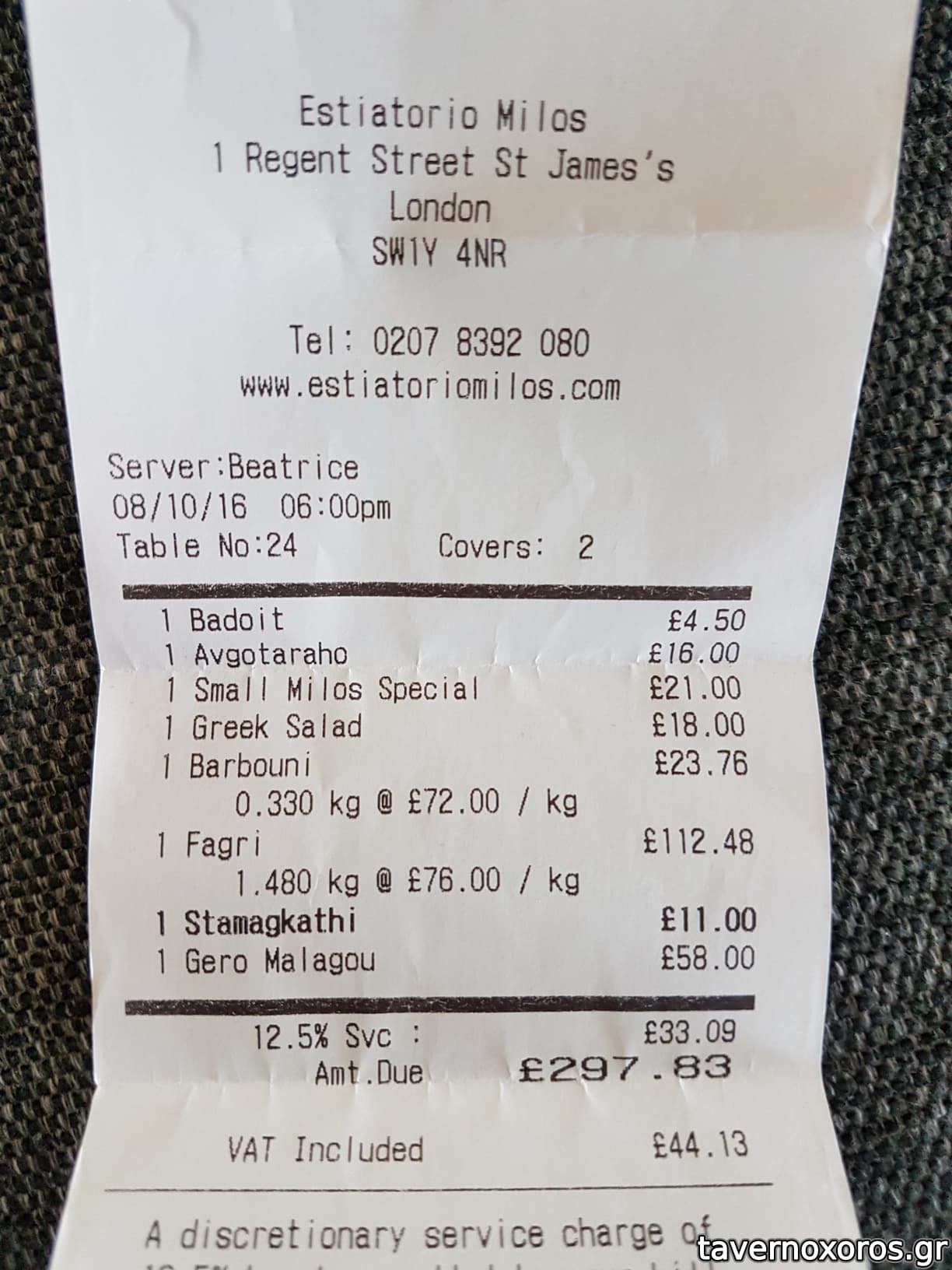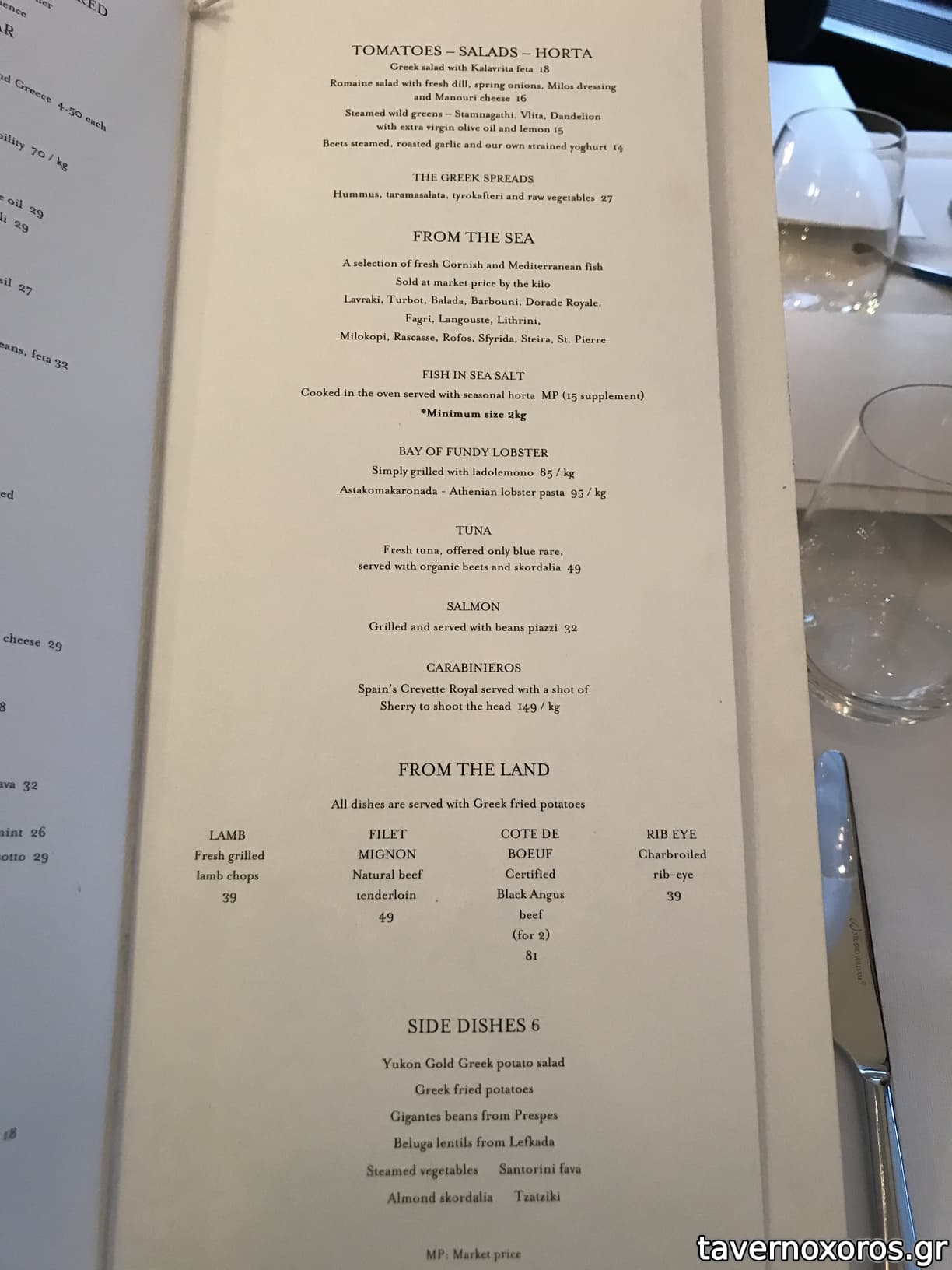 Τιμές: εδώ είναι που το πράγμα αποκτά ενδιαφέρον... η χωριάτικη σαλάτα στα 20 ευρώ, και τα τηγανιτά κολοκύθια και μελιτζάνες στα 25 ευρώ. Οι τιμές στ φρεσκα ψάρια ξεκινούν από 80 ευρω και άνω /κιλό. Μαλαγουζιά Γεροβασιλείου στα 62 ευρώ. Με άλλα λόγια, ακόμη και ψάρι να μην παρει κανείς, δεν υπάρχει περίπτωση να την βγάλετε με λιγότερο από 80 ευρώ το άτομο. Λογικό, όταν ο πελάτης πρέπει να καλύψει το ενοίκιο, μεγάλο κόστος προσωπικούκαι τέλος αεροπορικά εισητήρια των ψαριών & της ντομάτας (αξιώνουν ότι τα φέρνουν την πλειοψηφία των ψάριων και άλλων προιόντων από Ελλάδα...