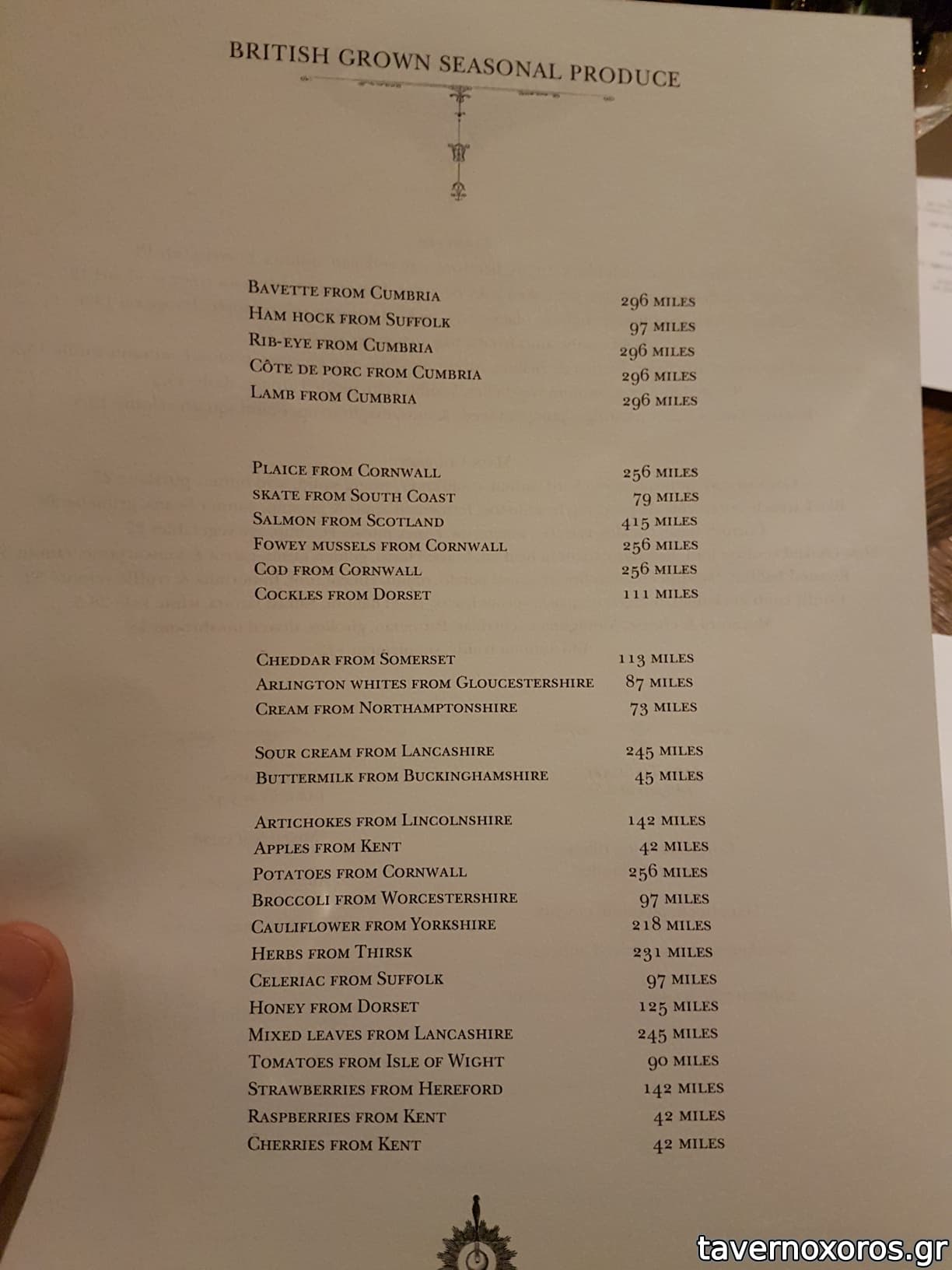 Ευρωπαική κουζίνα, πάρα πολύ γευστικά πιάτα και γενναιόδωρες μερίδες για 1 αστέρι Michelin. Πέρδικα τρυφερότατη για ορεκτικό, άγρια μανιτάρια , χοιρινό σε βάζο ωραίο, για κυρίως δοκιμάσαμε ένα καταπληκτικό σιγοψημένο αρνάκι και ένα ribeye ωρίμανσης 60 ημερών . Επιδόρπιο πήραμε ένα πολύ ενδιαφέρον πιάτο με σύκα και μια κρέμα τυριού stilton και παγωτό. Όλες οι μερίδες ήταν πολυ καλές, κυριολεκτικά σκάσαμε στο φαγητό! Καλή παρουσίαση και εκτέλεση.