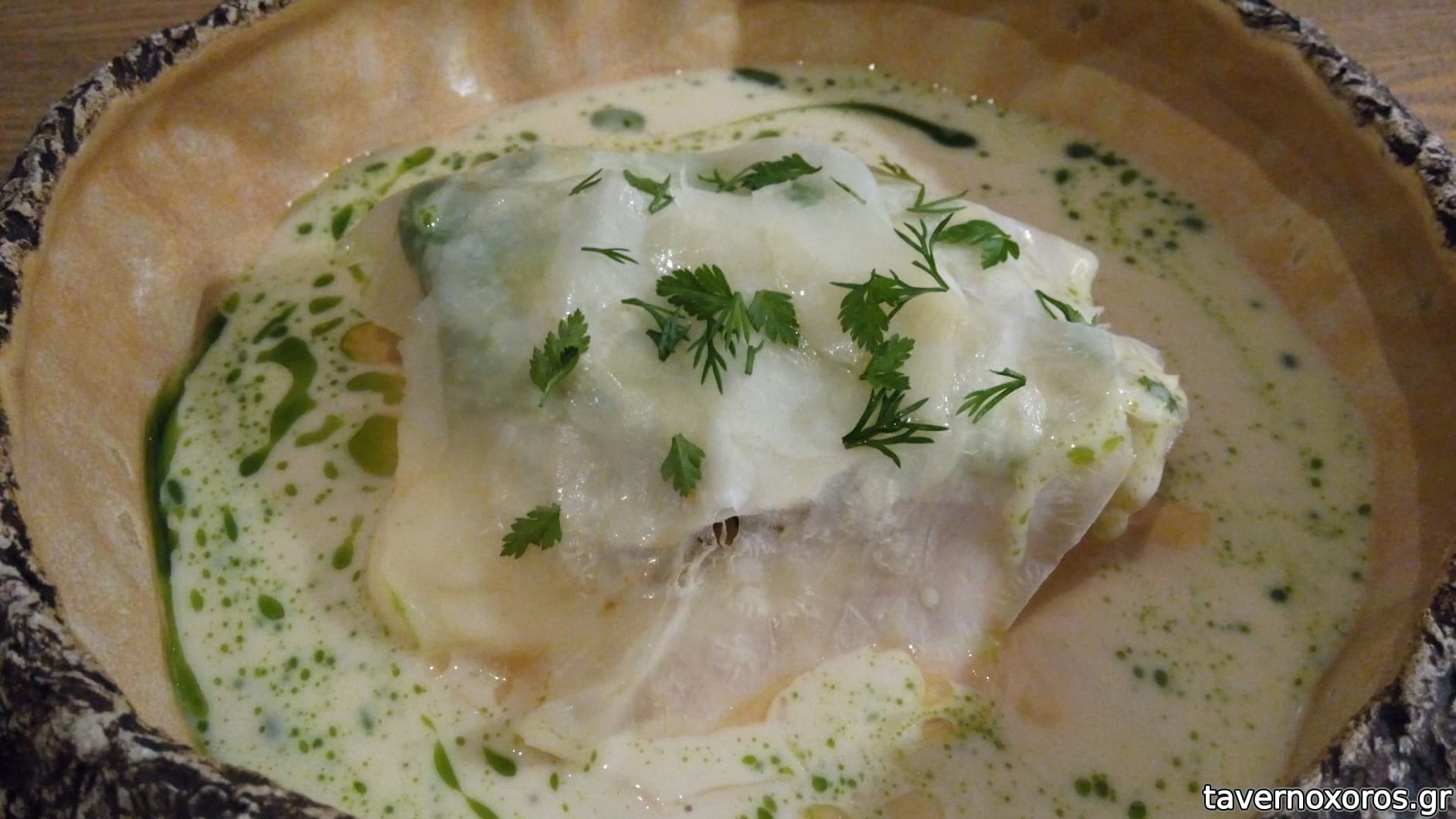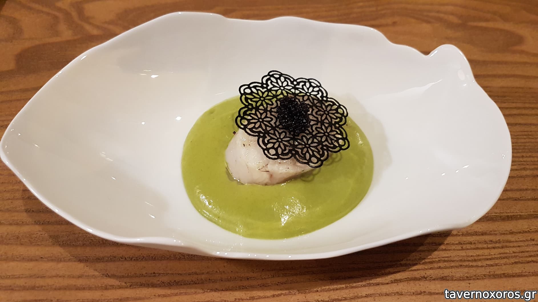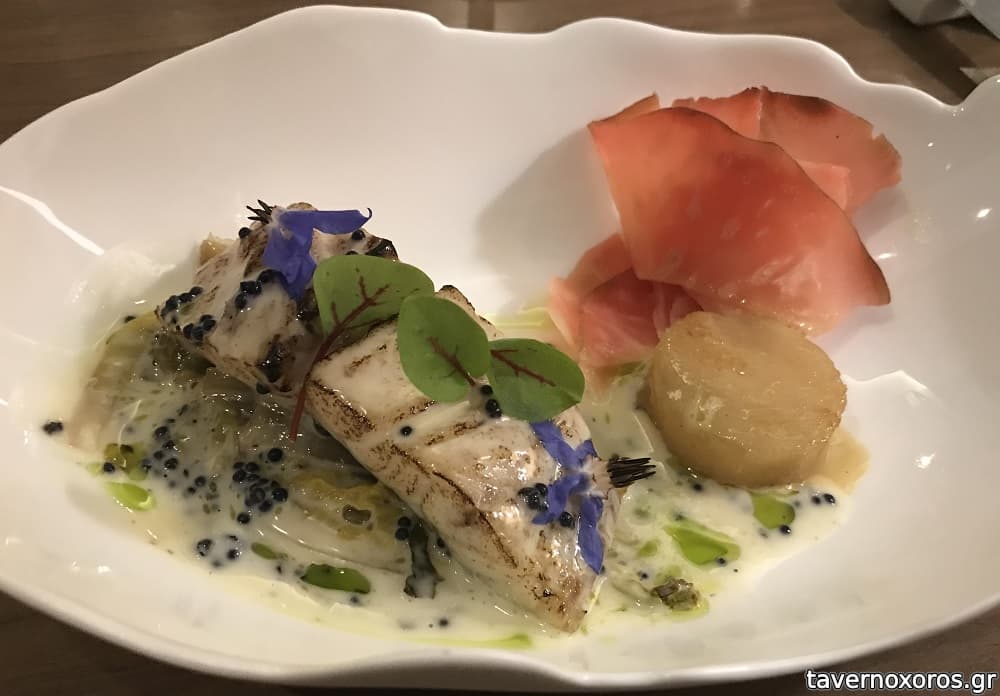 Menu "Trip", πιάτο 3/4: "Ψάρι ημέρας με μους από καμένο βούτυρο και πράσο" (μου έτυχε σφυρίδα, εξαιρετικό)