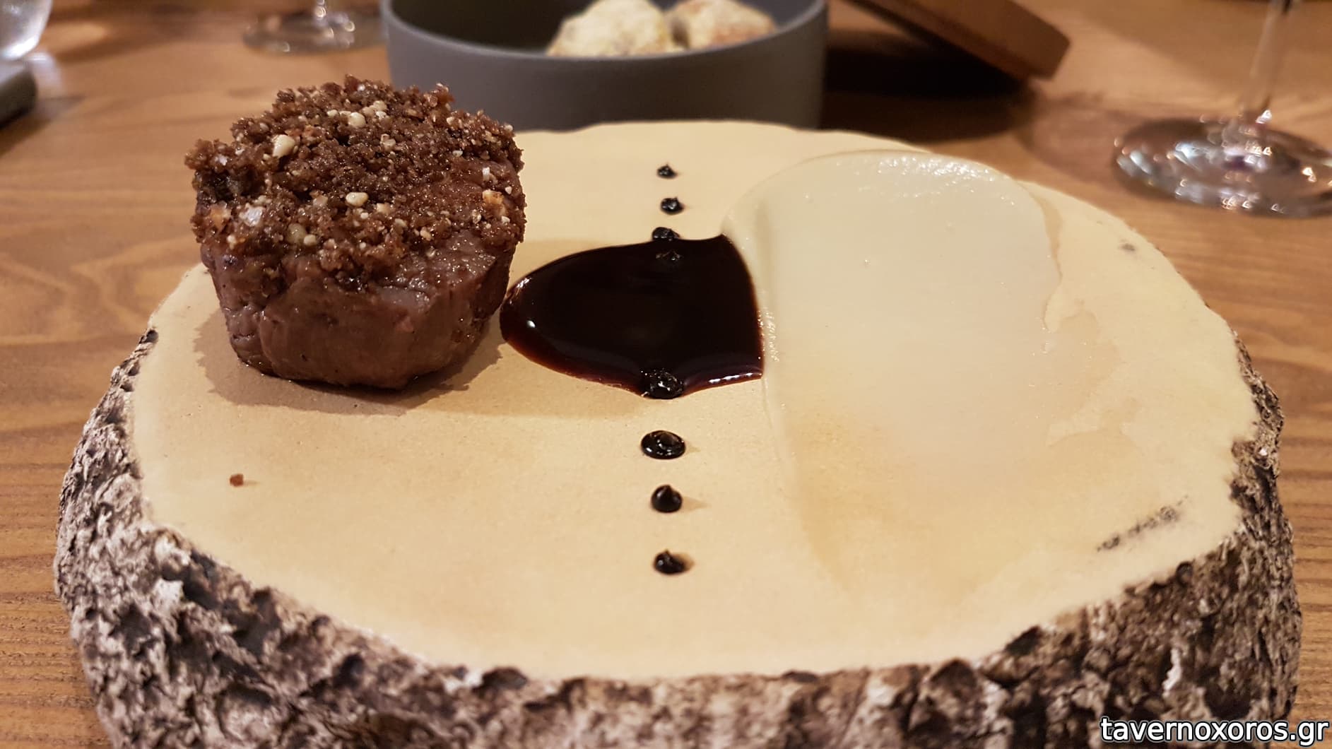Menu "Trip", πιάτο 4/4: "Μοσχάρι angus περασμένο από τα κάρβουνα με topinambour, μαύρο σκόρδο και φουντούκια" (το μοσχάρι οκ, αλλά το topinambour πολύ καλό)