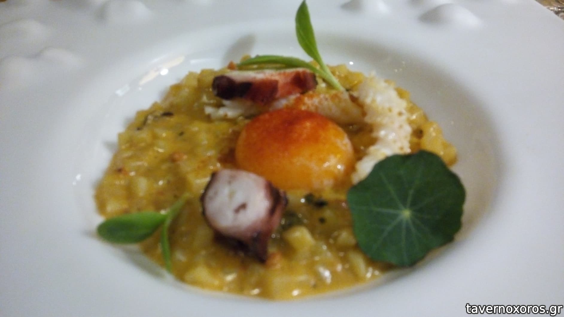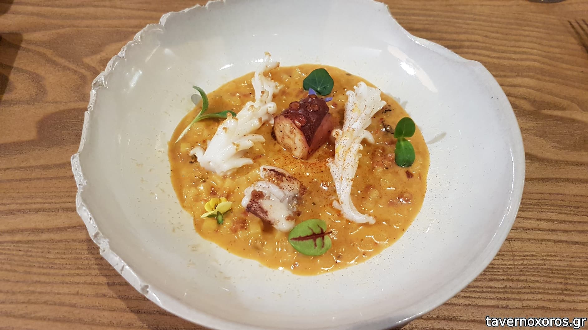 Menu "Trip", πιάτο 2/4: "Παέγια από πατάτα με καπνιστά μύδια, καλαμάρι και χταπόδι" (πολύ καλό)