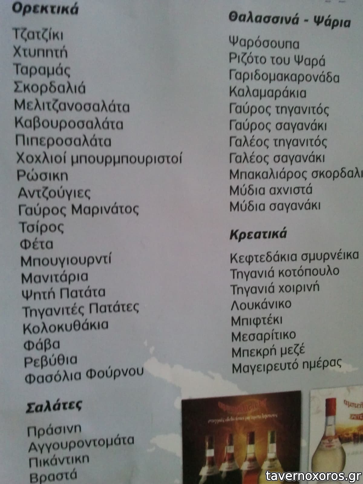 απο ψαρικά καλαμαράκια, μικρά ψάρια, μύδια σαγανάκι και αχνιστά, γαριδομακαρονάδα, πιλάφι θαλασσινών, μπακαλιάρο σκορδαλιά.