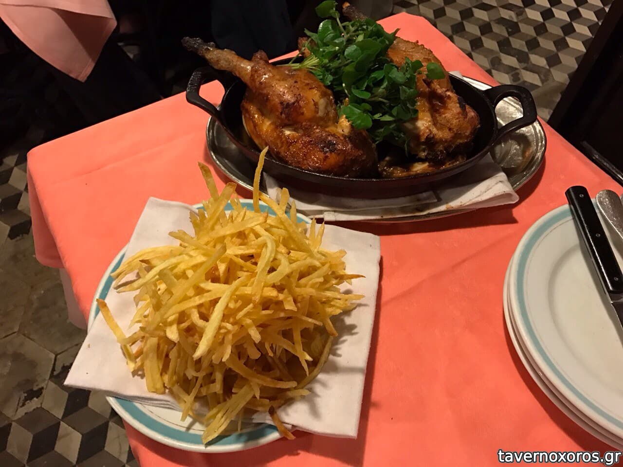 Πήραμε την ψητή αλανιάρα κότα, που ναι κ το πιο γνωστό του πιάτο σαν το καλύτερο του Παρισιού, για μοιρασιά δυο άτομα, που φέρνουν με μια μεγάλη τηγανιά πατάτες. Ψημένο στην γάστρα με λίπος χήνας ήταν ζουμερό κ πολύ καλό σε γεύση (όχι αντάξιο του κόστους όμως). Οι πατάτες δε, περισσότερο έμοιαζαν με πατατάκια.