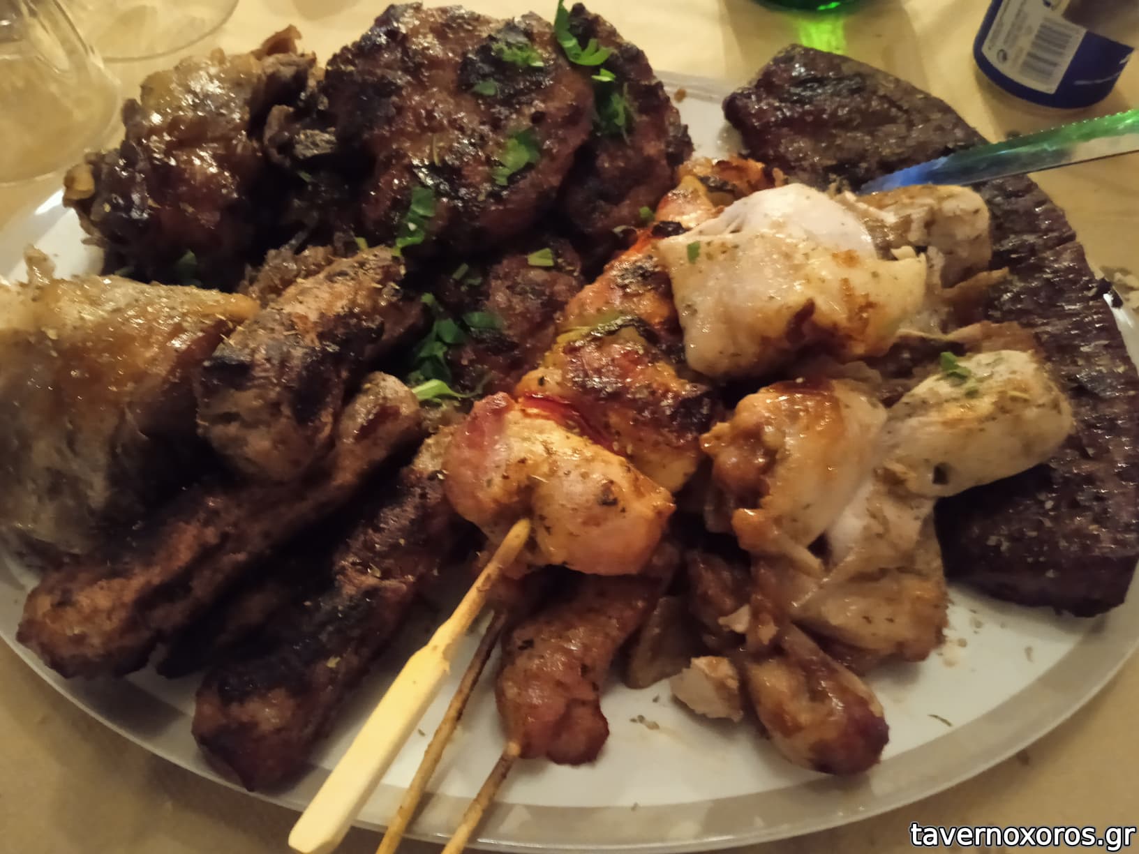 Πήραμε χόρτα, πιπεριές ψητές τ. Φλωρίνης (είπε ότι είναι από την Σκύδρα), μπάτζο σαγανάκι, πατάτες Αρχαγγέλου τηγανητές φρέσκιες, τζατζίκι, μαρούλι, καυτερές πιπεριές (δυστυχώς είχαν ψηθεί άλλη μέρα και ακολούθως τοποθετήθηκαν στο ψυγείο), πατάτες τηγανητές φρέσκιες με τηγανητά αυγά μάτια και τηγανητό χωριάτικο λουκάνικο, 1 μερίδα κεμπάπ κοτόπουλο, 1 μερίδα κεμπάπ αρνίσιο (με κόκαλα!), 2 σουβλάκια χοιρινά, 1 σουβλάκι κοτόπουλο, 3 μπιφτεκάκια, 3 σουτζουκάκια, 1 συκώτι, ρετσίνες, μπύρες, αναψυκτικά, νερά, ψωμάκι ψητό (βλ. φωτο).