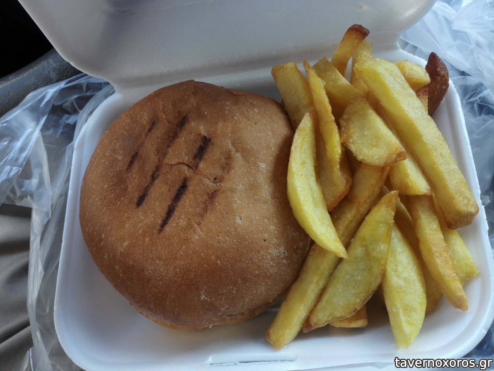 Μου το δωσαν σε καλαισθητο κουτακι μαζι με πολλες (σχεδον μεριδα) φρεσκοτηγανισμενες καλες οριτζιναλ πατατες.