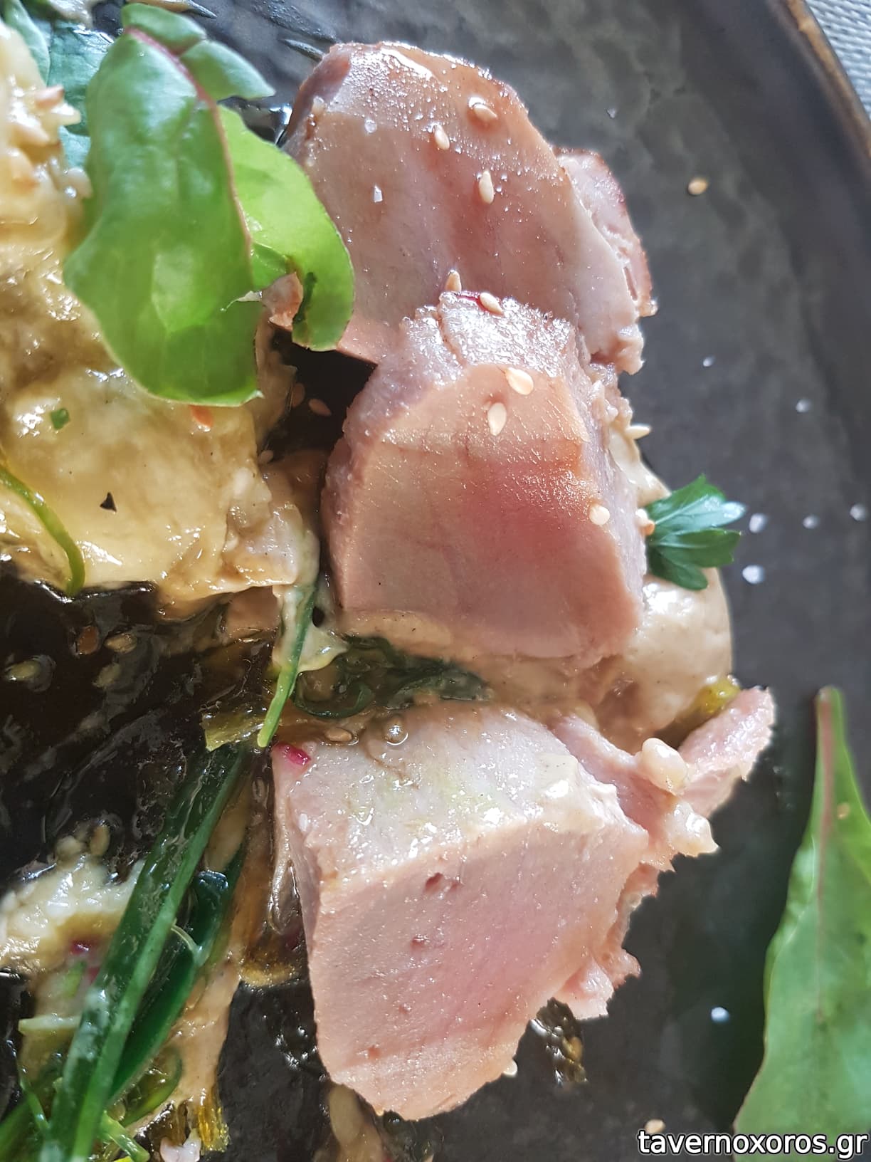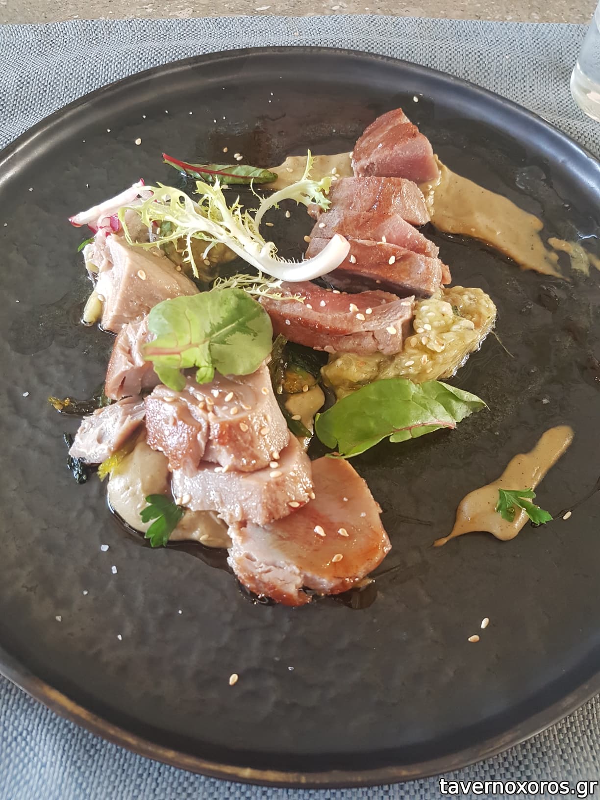 "Τόνος ψητός τατάκι με υφές μελιτζάνας/σουσάμι & εσπεριδοειδή" (οκ, αλλά είχε παραψηθεί και γι' αυτό δε θύμιζε τατάκι)