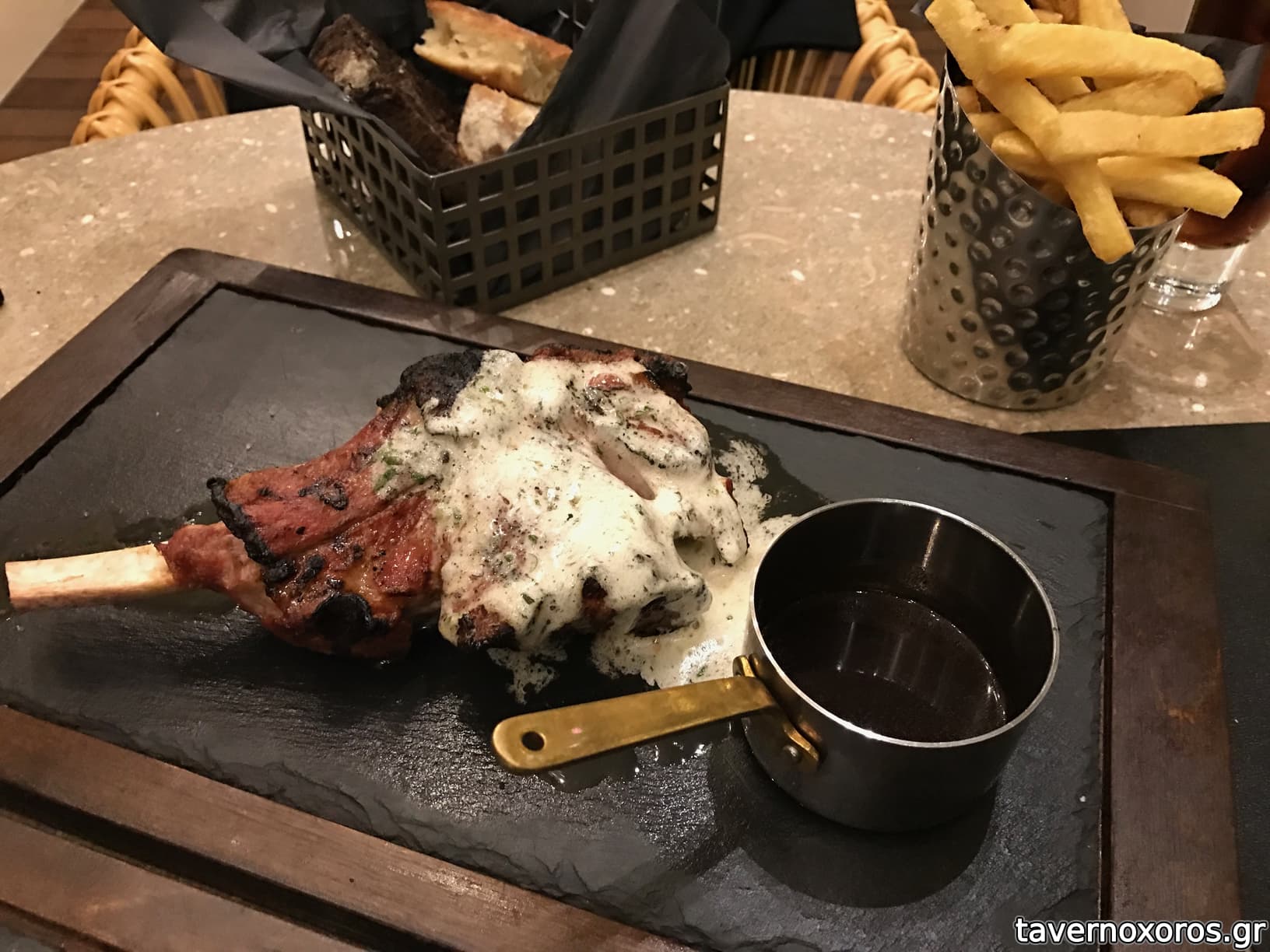 Η μεγάλη ωριμασμένη μπριζόλα στα 1100γρ ψαχνό (ένα πολύ μικρό κόκαλο μόνο στην άκρη) ήταν πάρα πολύ καλή στα 60 ευρώ/κιλό. Θα έλεγα αν όχι το καλύτερο, σίγουρα ένα από τα καλύτερα μοσχάρια που έχω φάει (ισπανική ράτσα).