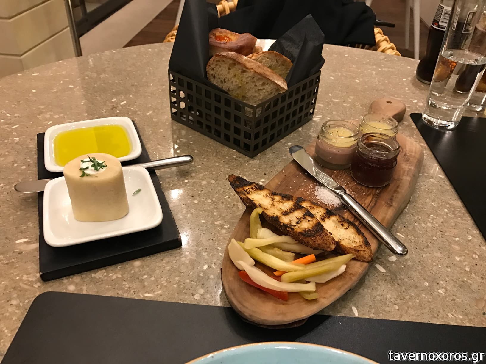 Καλωσόρισμα: πατέ από συκωτάκια πουλιών και ψωμί με βούτυρο και μεδούλι (πολύ νόστιμα)