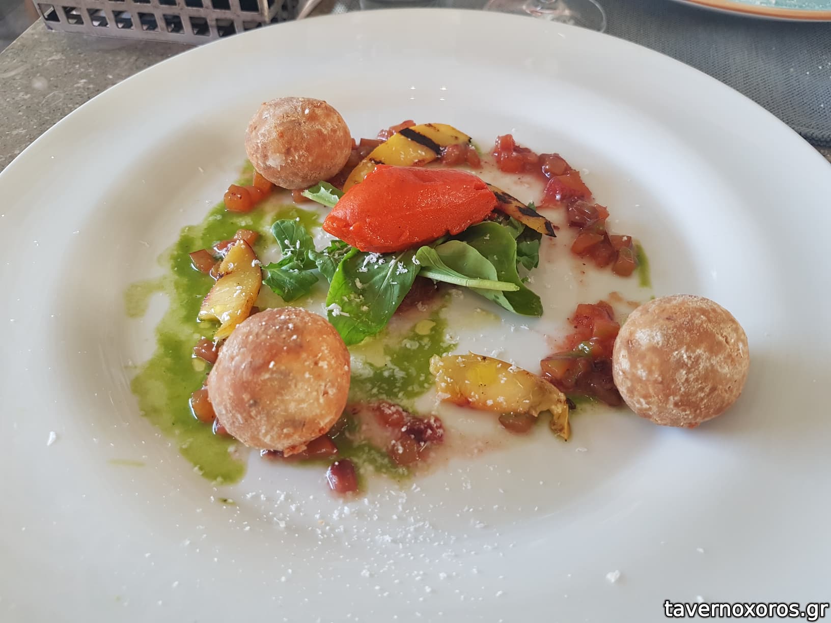 "Κροκέτες με Jamon Iberico & κατσικίσιο τυρί, ψητό νεκταρίνι, σορμπέ κόκκινης πιπεριάς, πέστο ρόκας" (καλό, αλλά όχι συγκλονιστικό, το σορμπέ ήταν το χάι λάιτ)