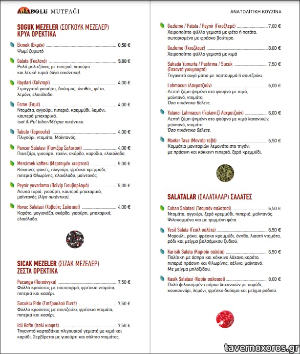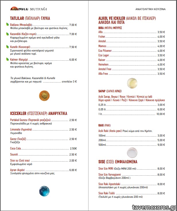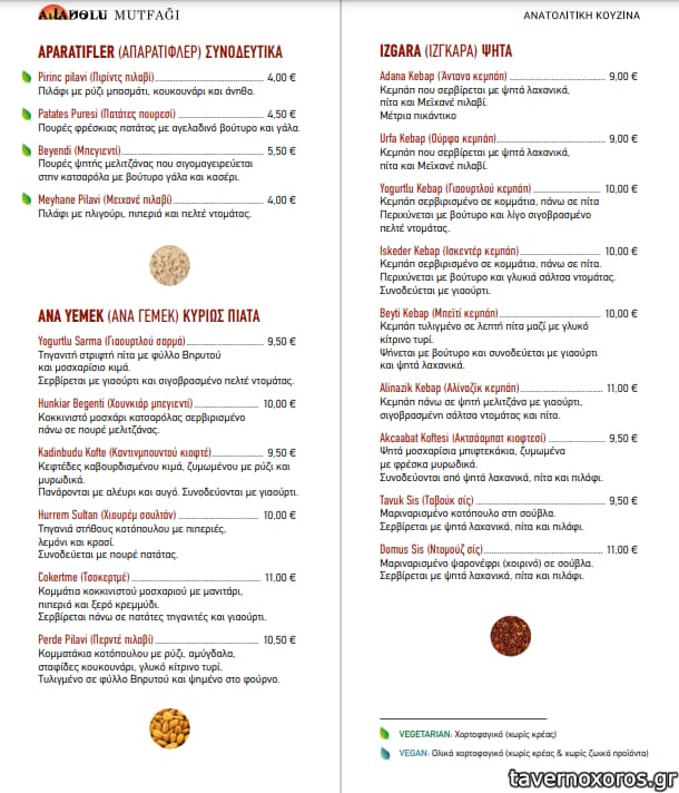 Το μαγαζί το δουλεύουν Τούρκοι και έχει εξαιρετική τούρκικη κουζίνα. Σε αντίθεση με τις γεύσεις το περιβάλλον δεν αντανακλά τον ιδιαίτερο χαρακτήρα του. Τρίτη επίσκεψη προσφάτως και έχουν δοκιμασθεί αρκετά πιάτα. Ξεχωρίζουν: