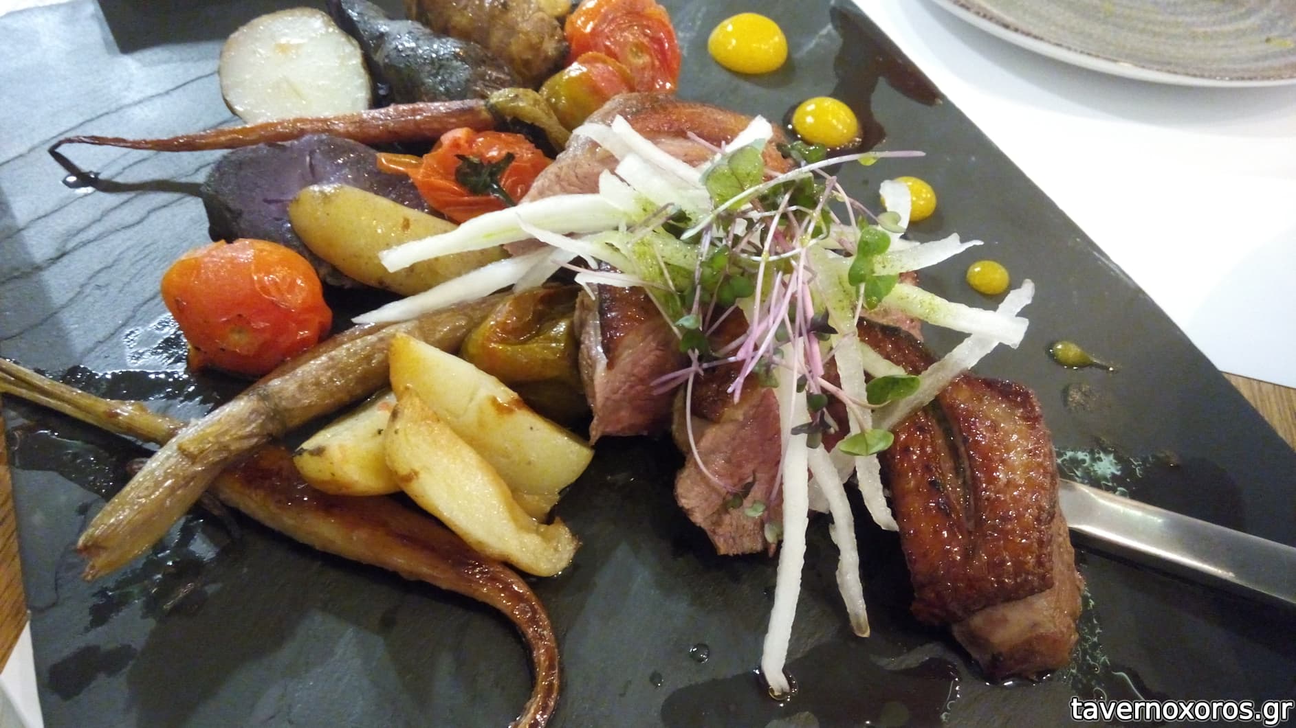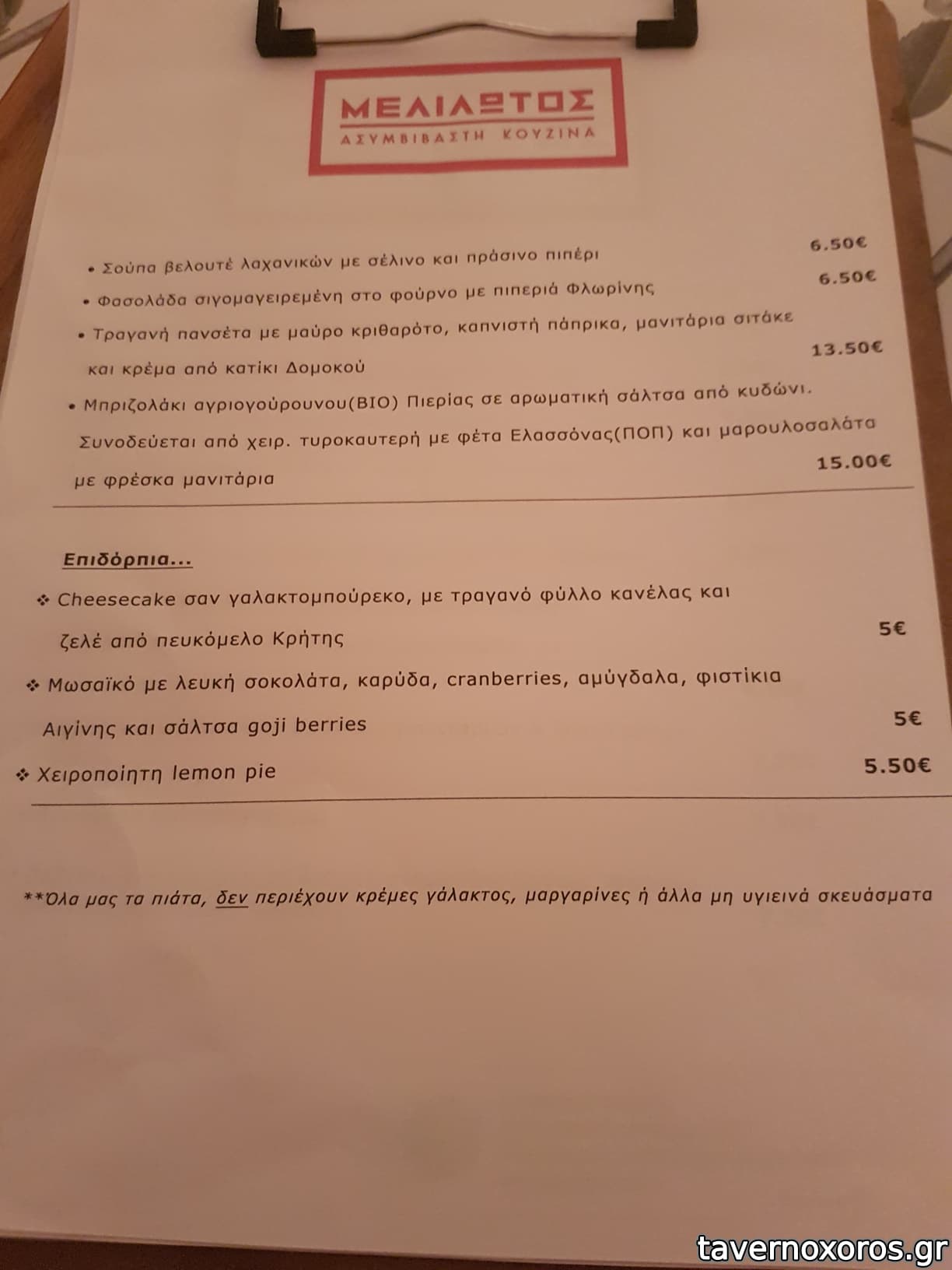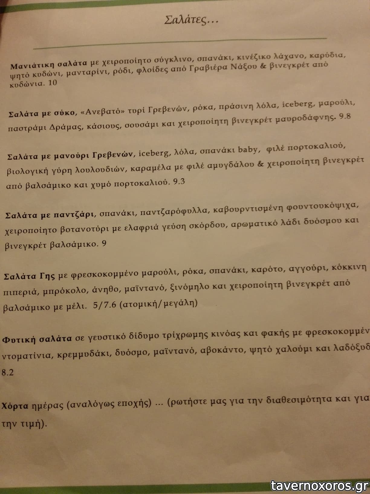 "Μπριζολάκι αγριογούρουνου (bio) Πιερίας σε αρωματική σάλτσα από κυδώνι. Συνοδεύεται από χειροποίητη τυροκαυτερή με φέτα Ελασσόνας (ΠΟΠ) και μαρουλοσαλάτα με φρέσκα μανιτάρια" (το αγιογούρουνο εξαιρετικά, η τυροκαυτερή αδιάφορη)