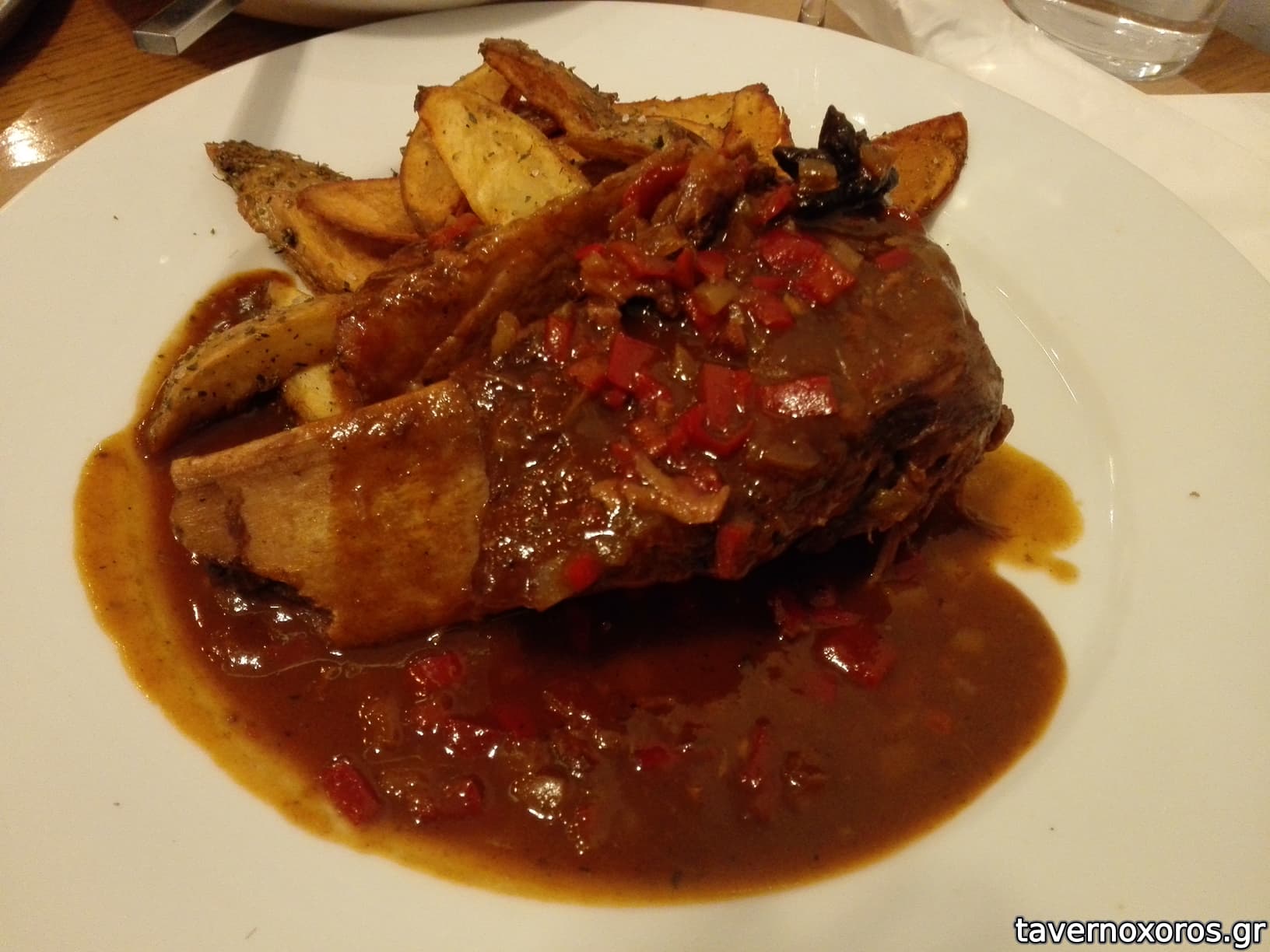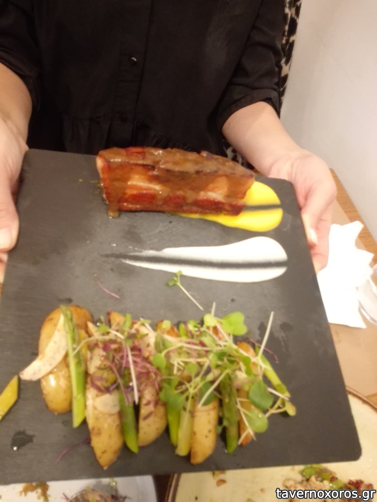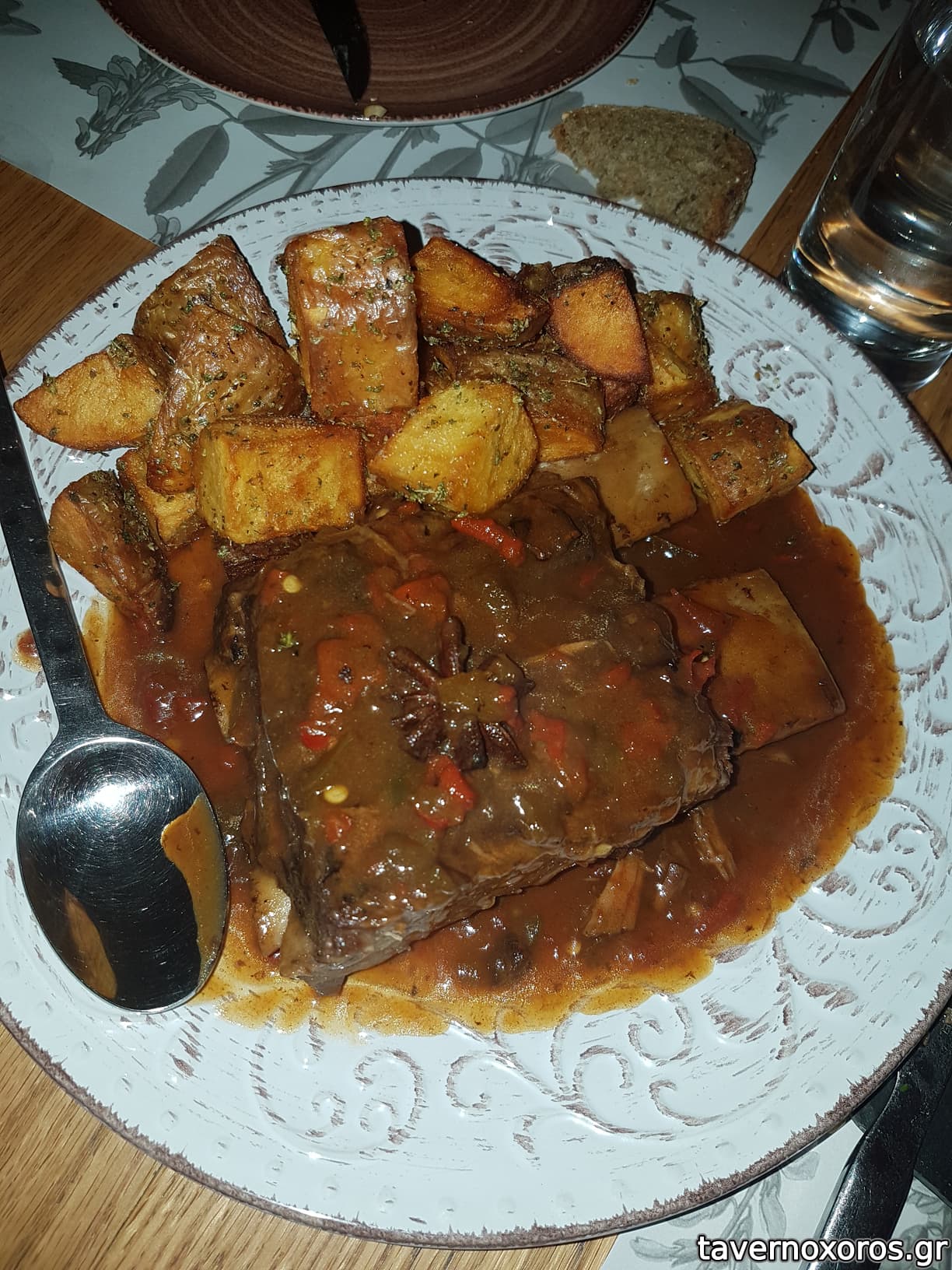 "Μοσχαρίσιος σιδηρόδρομος σιγοψημένος 4 ώρες στο φούρνο, σε ελαφρώς πικάντικη σάλτσα από χειροποίητη μαρμελάδα πιπεριάς με γλυκάνισο. Συνοδεύεται από πατάτες με τη φλούδα τους" (καλό)