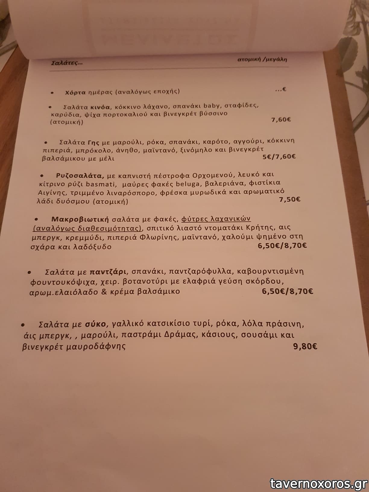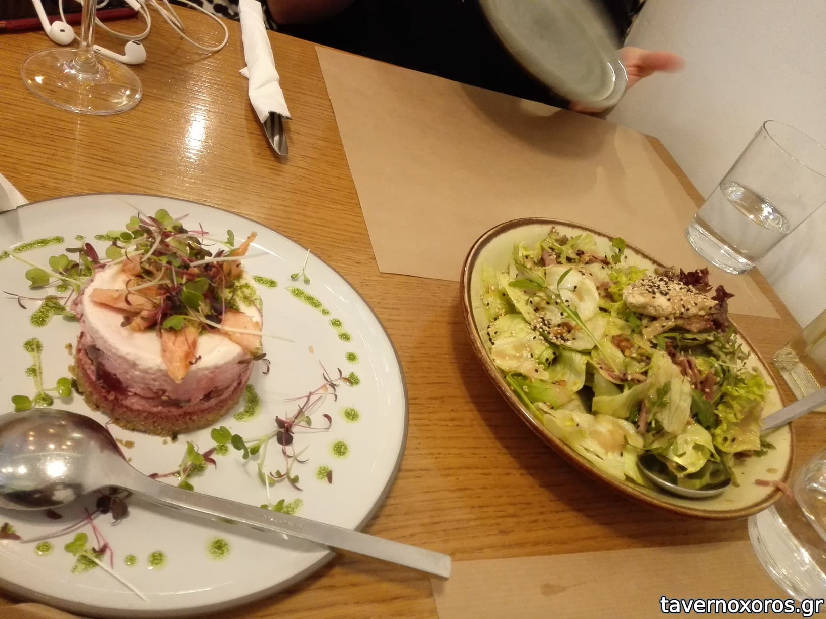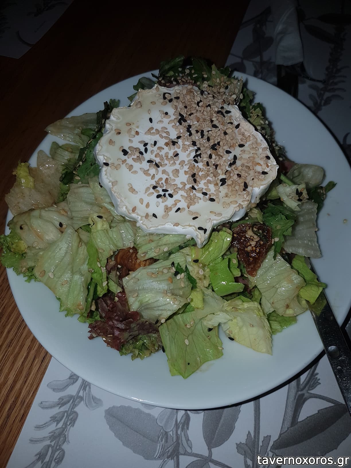 "Σαλάτα με σύκο, γαλλικό κατσικίσιο τυρί, ρόκα, λόλα πράσινη, άις μπεργκ, μαρούλι, παστράμι Δράμας, κάσιους, σουσάμι και βινεγκρέτ μαυροδάφνης" (οκ)