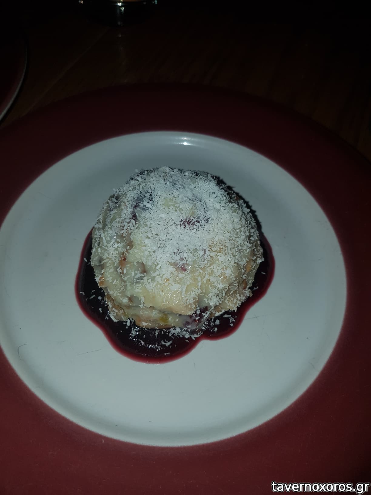 "Μωσαϊκό με λευκή σοκολάτα, καρύδα, cranberries, αμύγδαλα, φιστίκια Αιγίνης και σάλτσα goji berries" (οκ)