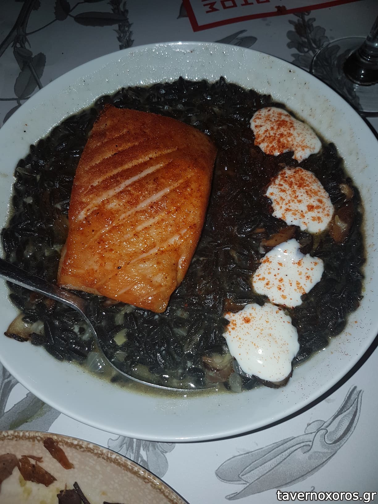 "Τραγανή πανσέτα με μαύρο κριθαρότο, καπνιστή πάπρικα, μανιτάρια σιτάκε και κρέμα από κατίκι Δομοκού" (η πανσέτα σκέτο λίπος, που προσωπικά μου αρέσει, το κριθαρότο πολύ μέτριο)