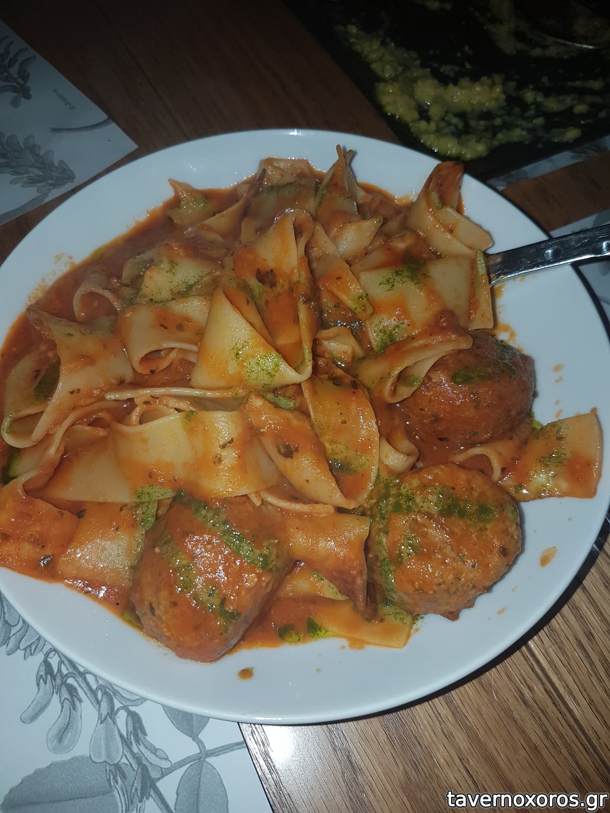 "Παραδοσιακά κεφτεδάκια μόσχου, σε σάλτσα ντομάτας με φρέσκο δυόσμο, ψημένα στο φούρνο με χωριάτικες παπαρδέλες και καπνιστό τυρί Μετσοβόνε (ΠΟΠ)" (πολύ μέτρια)