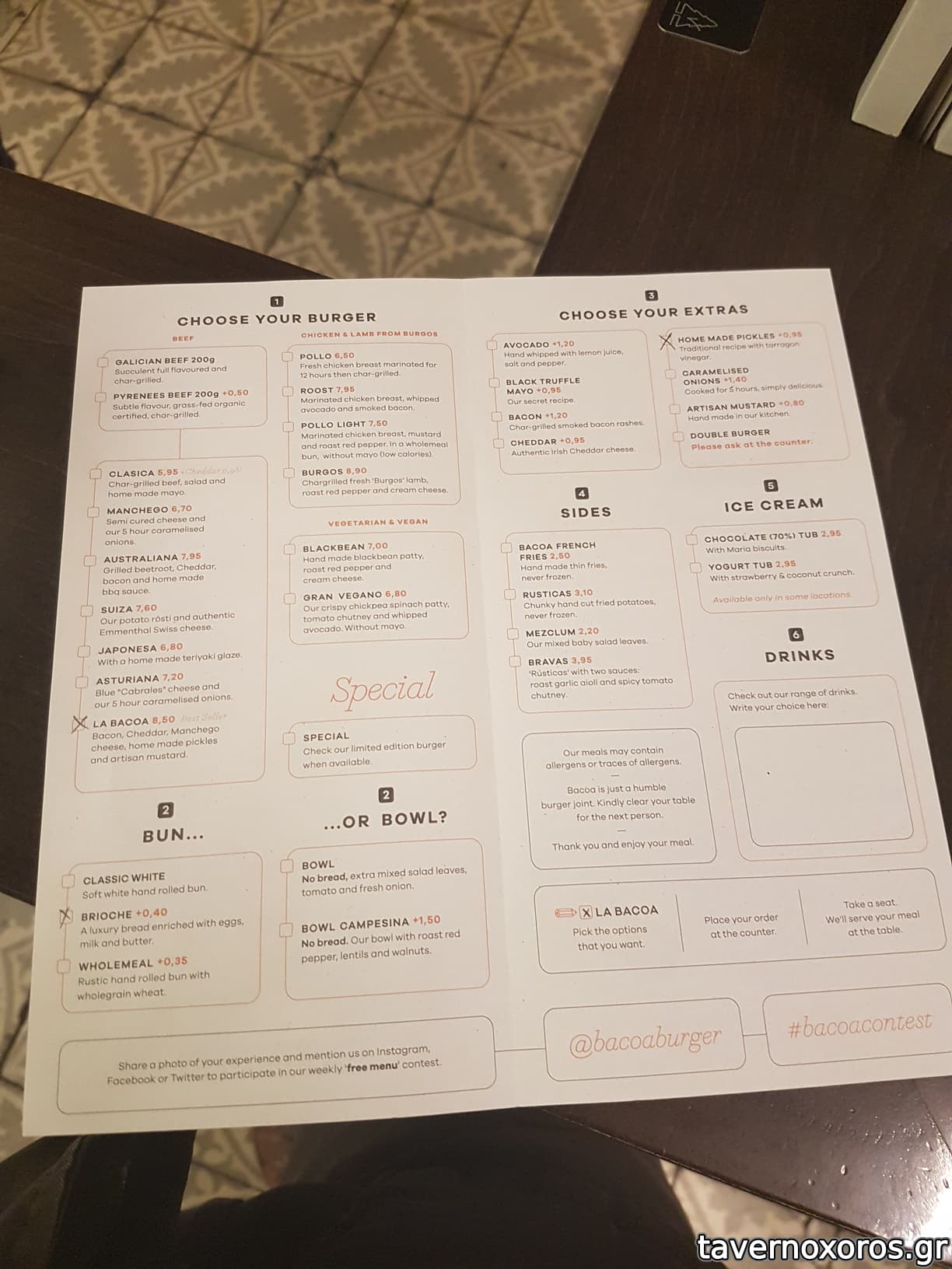 Έκατσα Φλεβάρη 2017. Μπεργκεράδικο με συμπαθητικό χιπστερικό ύφος, όπου συμπληρώνεις μόνος σου το δελτίο παραγγελίας, όπως το πρωτογνώρισα στο Kiosko. Προσωπικό αδιάφορο και σνομπ. Δοκίμασα το ομώνυμο "La Bacoa" burger που ήταν πολύ δυνατό. Πατάτες μέτριες. Αξίζει, το προτείνω.