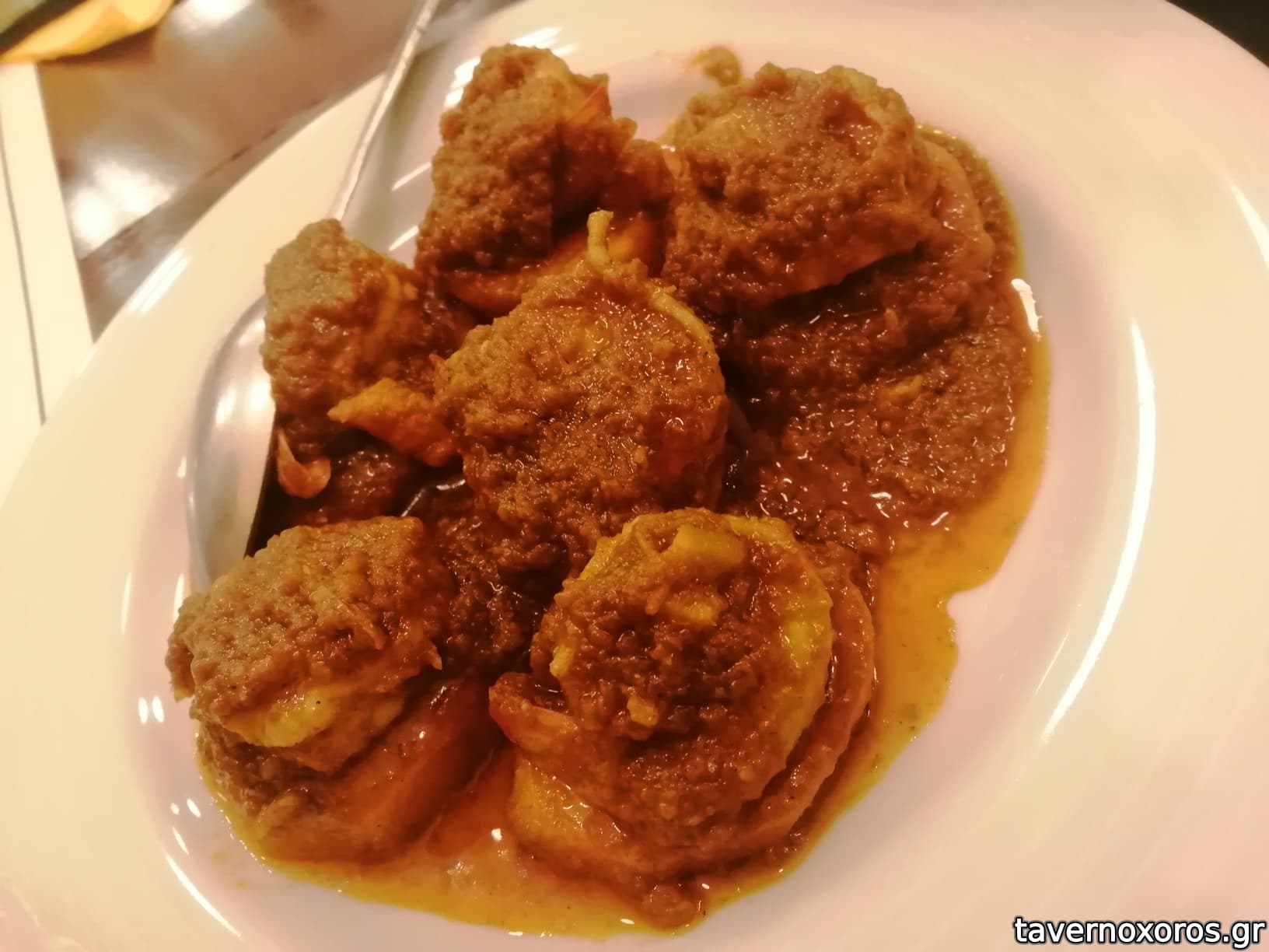 "Γαρίδες με γλυκοπατάτα μπουρδέτο" = 18 ευρώ