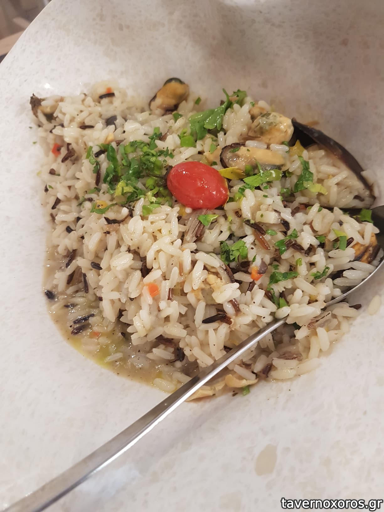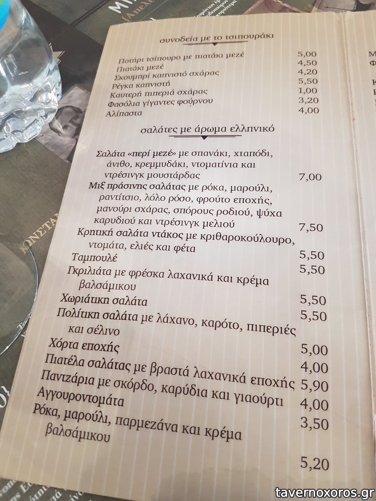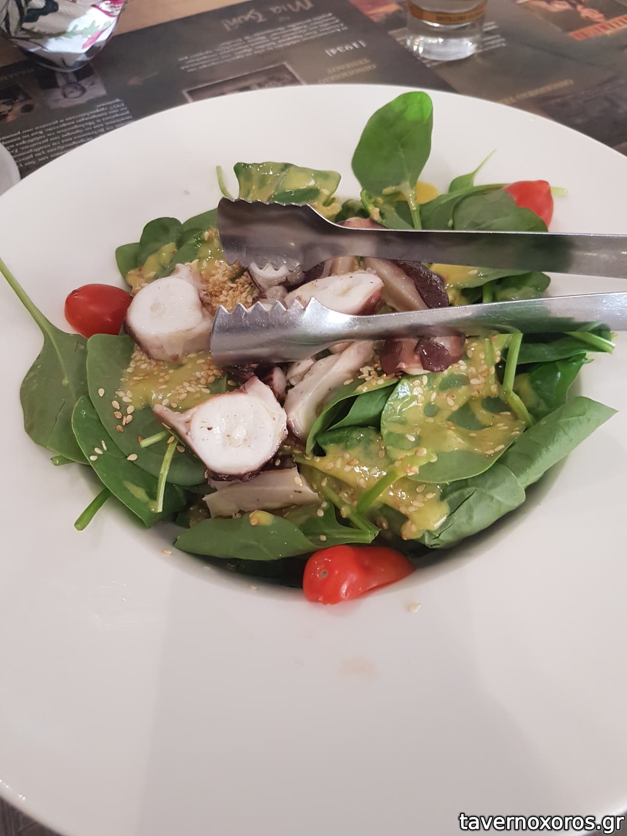 "Σαλάτα περί μεζέ με σπανάκι, χταπόδι, άνιθο, κρεμμυδάκι, ντοματίνια, και ντρέσιγκ μουστάρδας" (κακή, ειδικά το χταπόδι)
