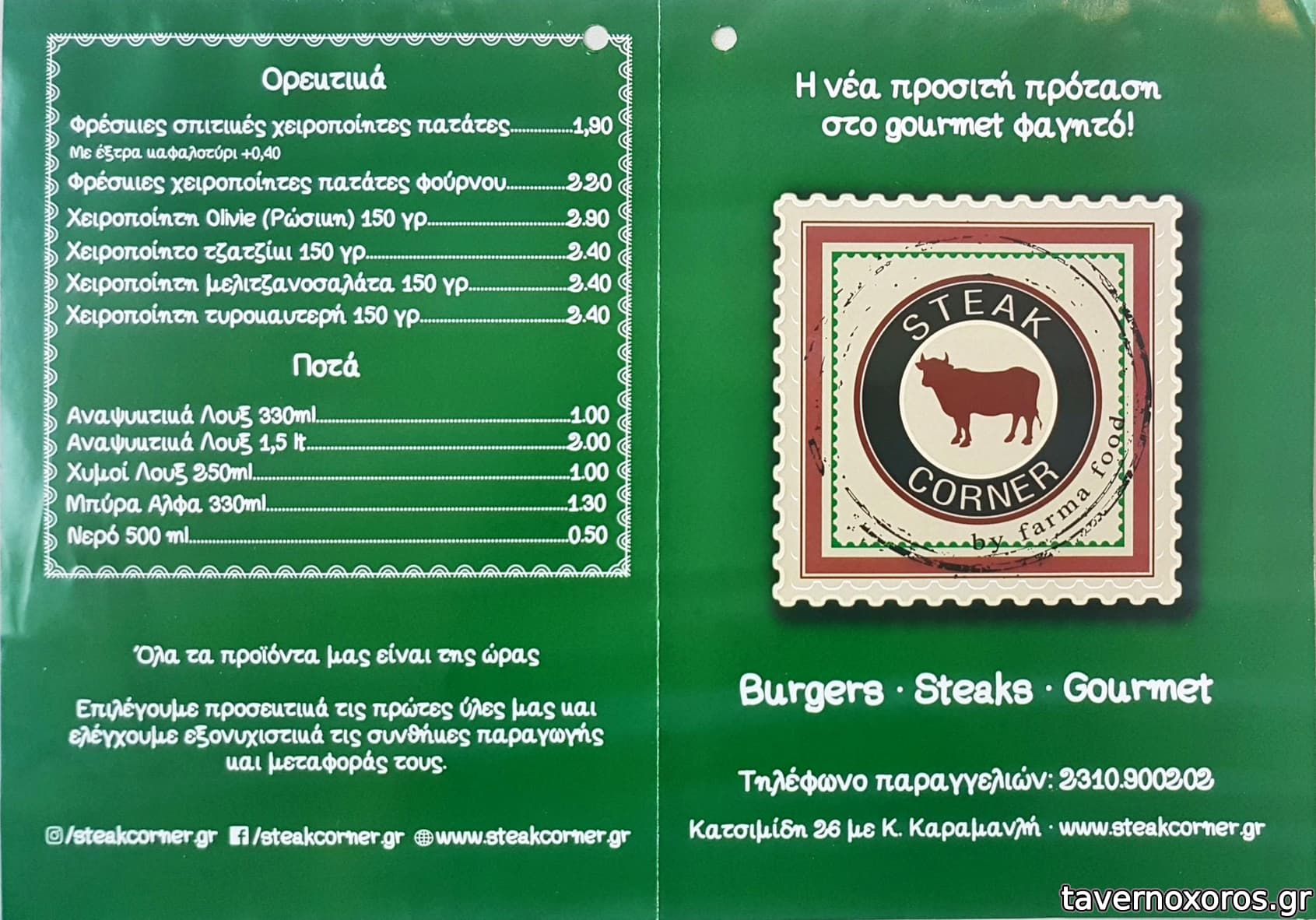 Το μαγαζί είναι περισσότερο για πακέτο-delivery. Εσωτερικά δεν έχει τραπέζια και εξωτερικά έχει μόνο stands. Οι άνθρωποι ευγενικοί, με χαρακτήρα συνοικιακού μαγαζιού. Είναι αργές οι παραγγελίες επειδή δεν έχουν προψημένα και τα κάνουν εκείνη τη στιγμή, πράγμα που το προτιμώ. Ο κατάλογος έχει πέρα από τα κλασικά, σάντουιτς με μάγουλα, γλώσσα και συκώτι, καθώς και μπριζόλες. Από τα λίγα που δοκίμασα μέχρι στιγμής, φαίνεται το φαγητό να είναι πάνω από το μέσο όρο της πόλης, παρόλο που χωράει βελτίωση. Καθαρό σάντουιτς, χωρίς λάδια στις πίτες, με φρέσκες πατάτες (αν και όχι τόσο καλές), με δικές τους αλοιφές. Στα αρνητικά ότι μου φαίνονται ελαφρώς στεγνά, και ούτε βάζει μπόλικη αλοιφή. Το σάντουιτς με τα μάγουλα μου φάνηκε ενδιαφέρον, ενώ τα burger αδιάφορα. Τιμές όντως λίγο τσιμπημένες στα περίεργα κρέατα, αλλά καλές στα τυπικά κρέατα.