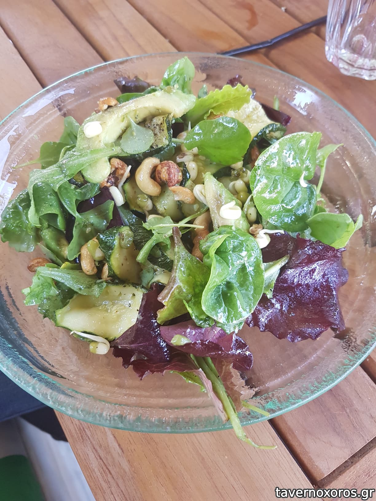 "Avocado, mung beans and courgette salad, cashews, orange and thyme drizzle" (οκ)