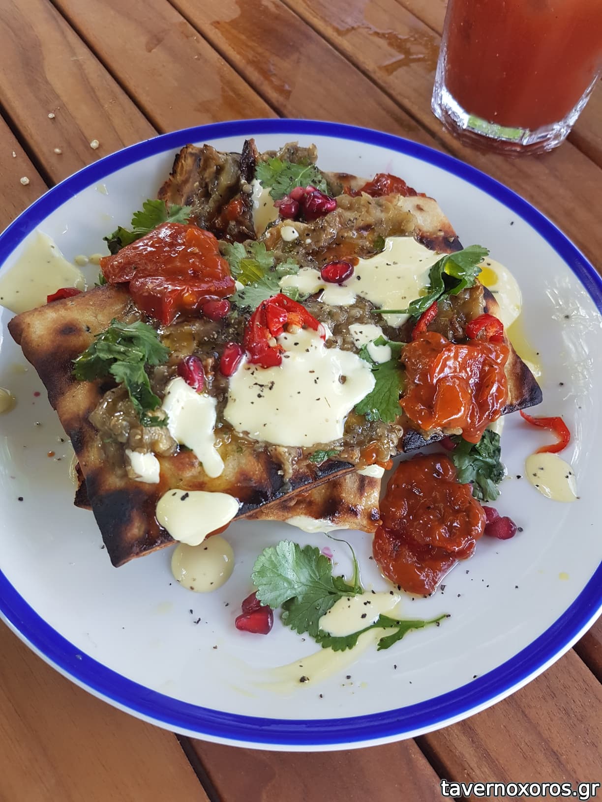 "Roast aubergine, chipotle relish, saffron yoghurt, pomegranate, charred flat bread" (καλό)