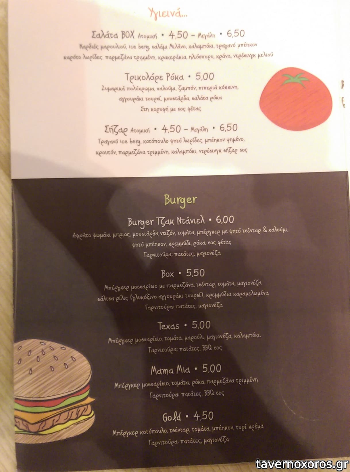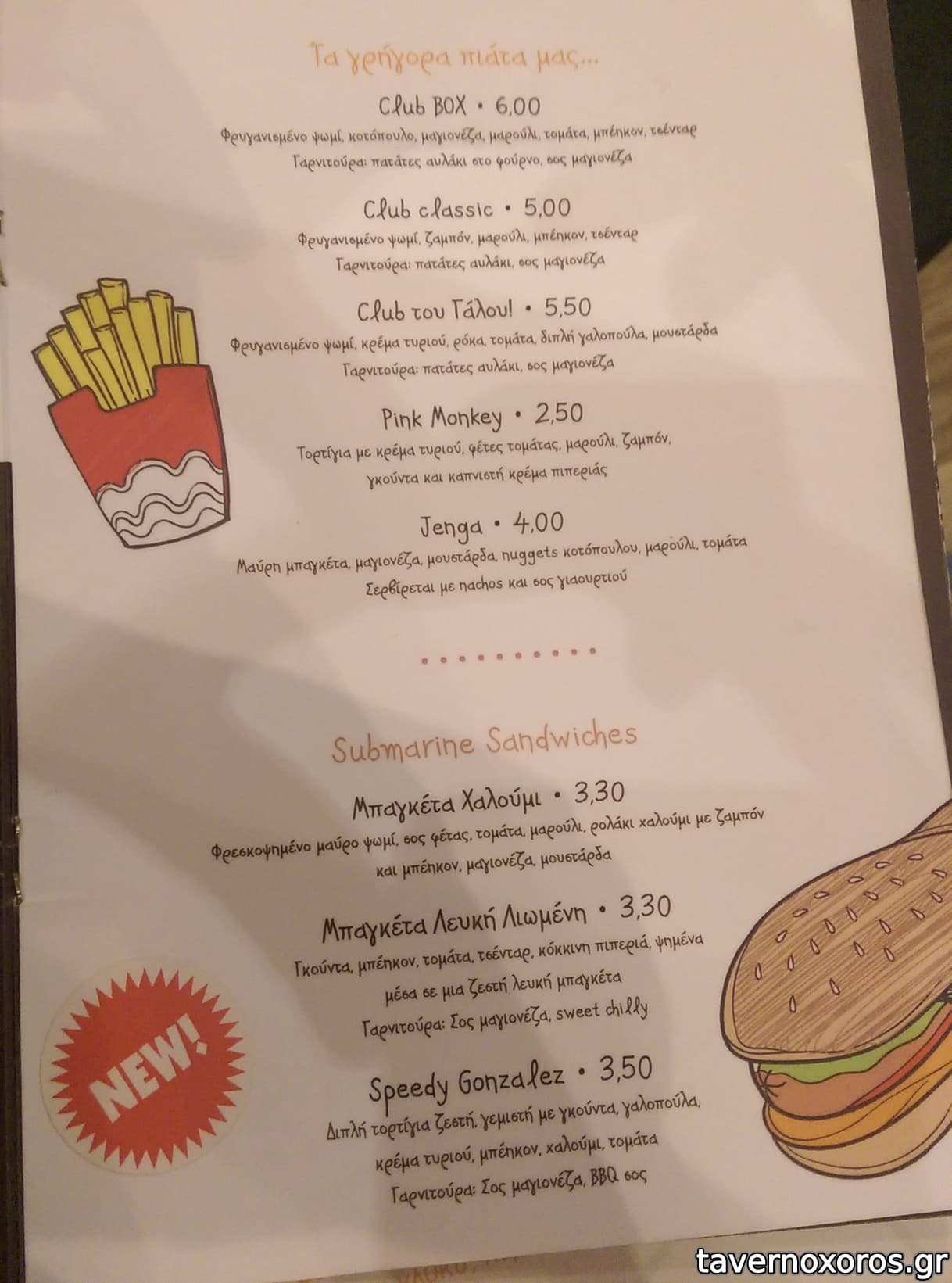 δοκιμαστηκαν το club box με φιλετο κοτοπουλο,τσενταρ,μπεικον κλπ και ηταν πολυ νοστιμο και χορταστικο με συνοδεια πατατας τηγανιτης (τυπου mcCain αυλακι) στα 6 ευρω.