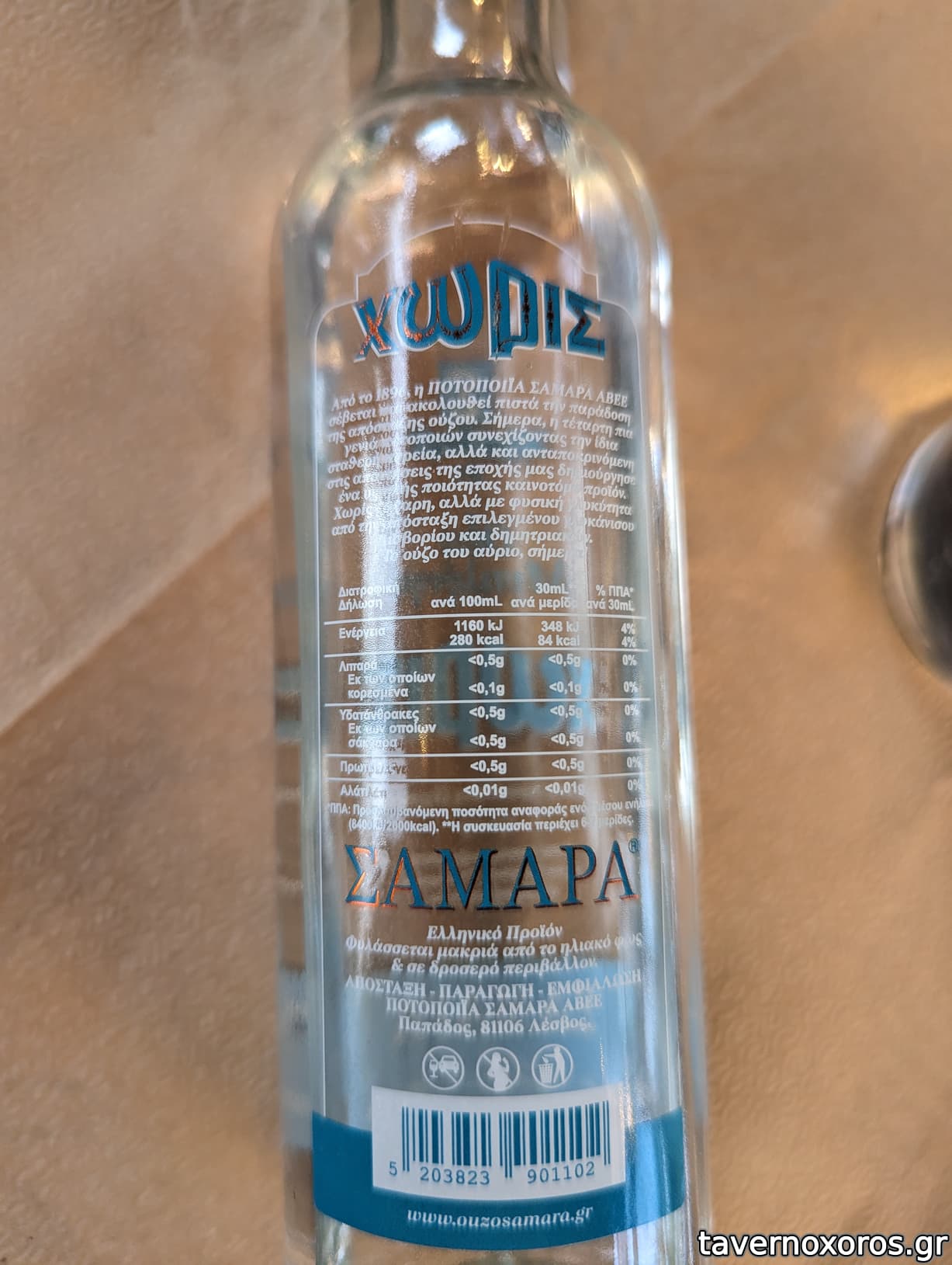 Ούζο "Χωρίς" της ποτοποιίας Σαμαρά (καλό, ίσως επειδή δεν έχει ζάχαρη θυμίζει τσίπουρο με γλυκάνισο)
