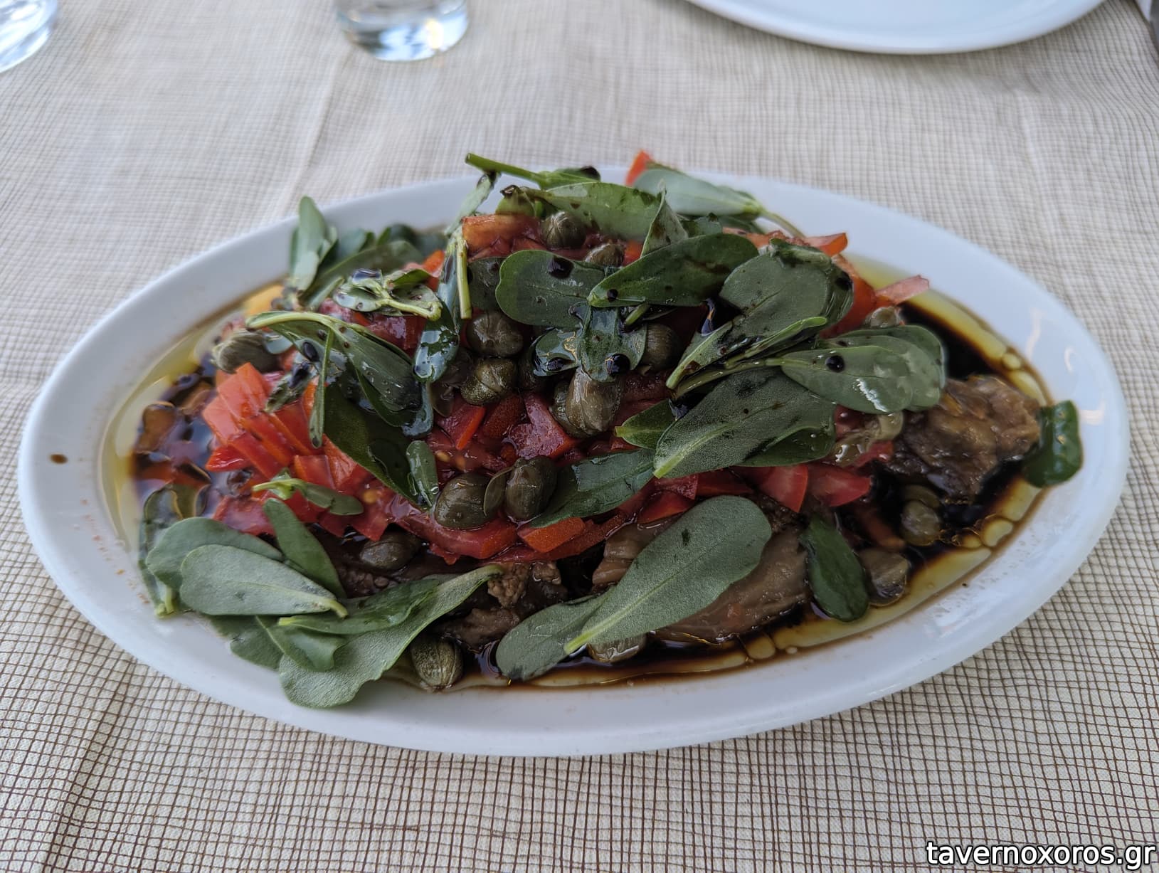 Μελιτζάνα ψητή με τριμμένη ντομάτα, κάπαρη και γλιστρίδα (μια χαρά)