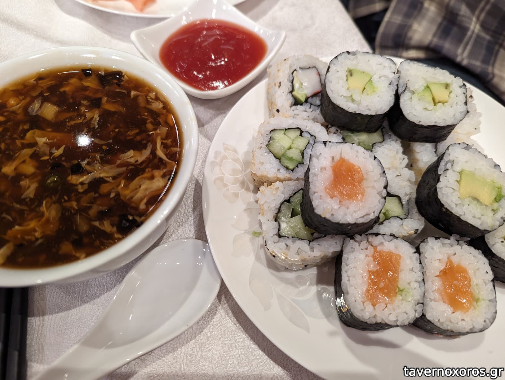 Καυτερή σούπα και ποικιλία μάκι με σολομό, καβούρι, αβοκάντο και αγγούρι