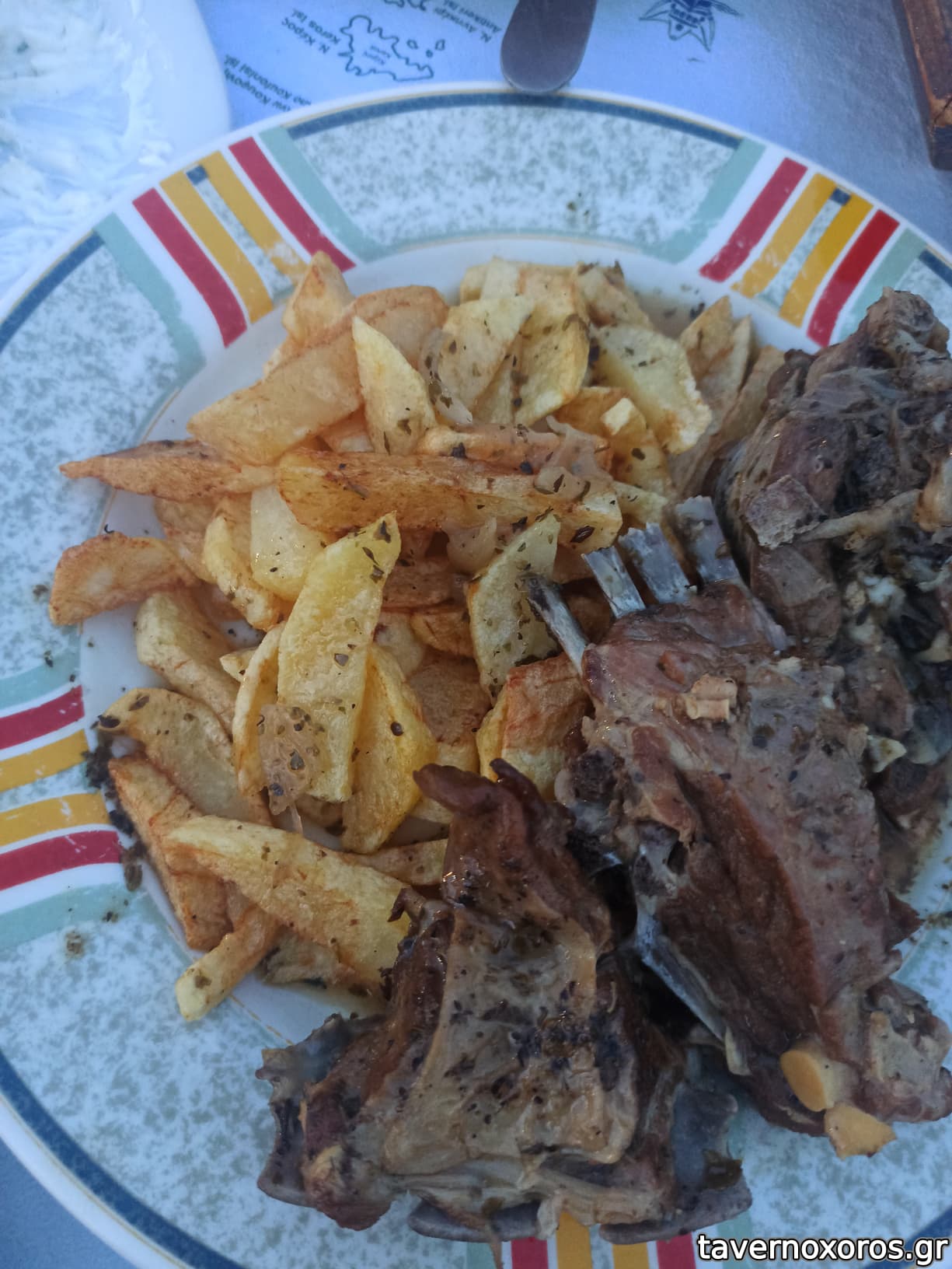 Δοκιμάσαμε κατσικάκι ριγανάτο με πατάτες τηγανιτές (νοστιμότατο), κολοκυθάκια βραστά σαλάτα (εξαιρετικά), τζατζίκι (πολύ καλό), ρεβυθάδα (πολύ καλή) και χορτόπιτα - καταπληκτική (η μερίδα έχει τέσσερα μεγάλα πιτάκια, αλλά είχαμε τη δυνατότητα να μας κάνουν μισή μερίδα, κάτι που ισχύει και για όλα τα πιάτα από ο,