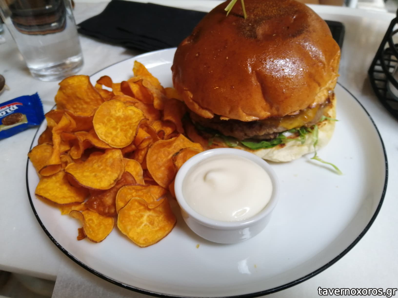 "Μπέργκερ" με τσένταρ, λαχανικά τουρσί, τσιπς γλυκοπατάτας (αποδεκτό, τα τσιπς αίσχος)