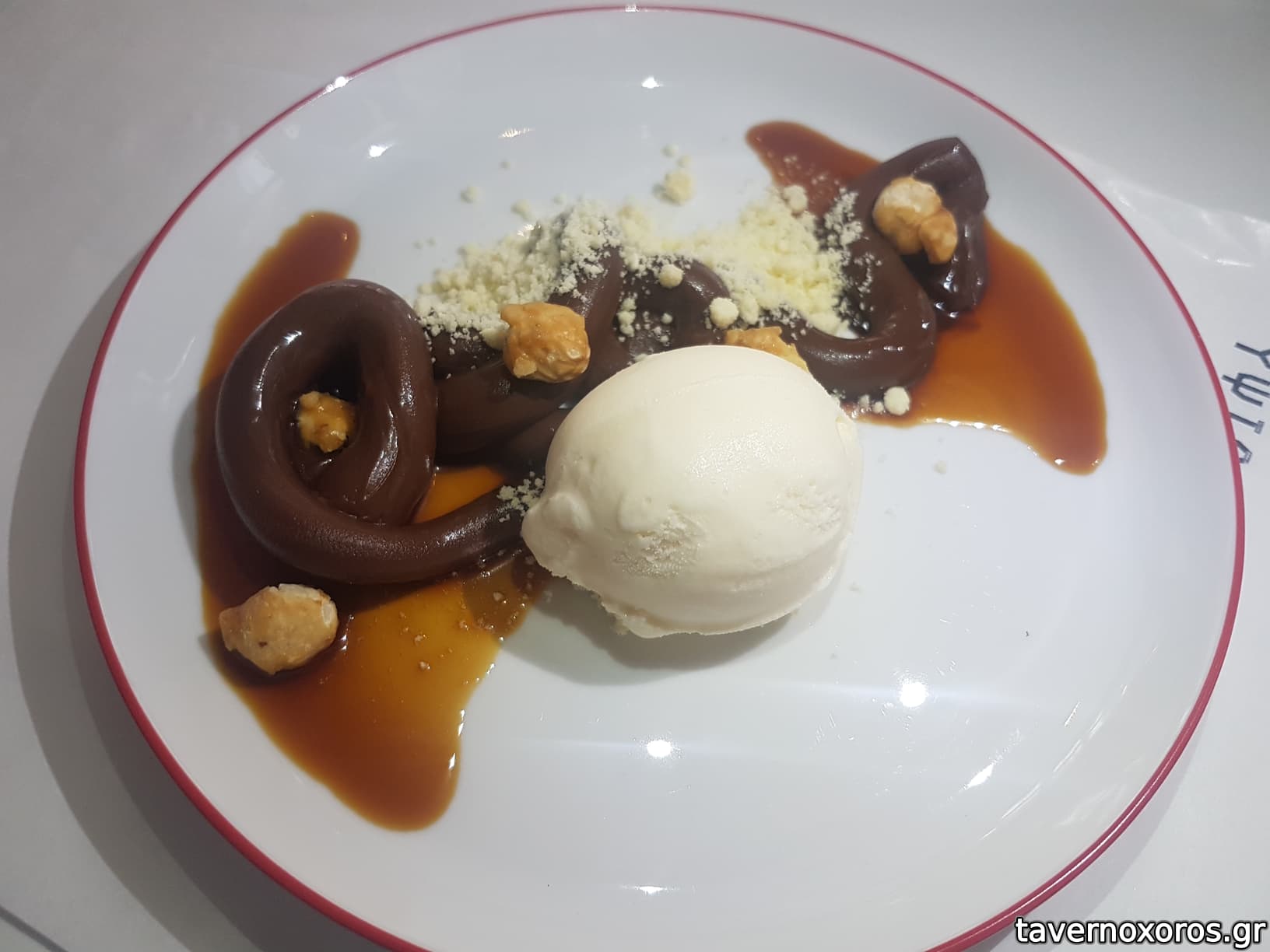 "Γκανάς σοκολάτας / με κράμπλ γάλακτος, παγωτό βανίλια, καραμέλα εσπρέσσο, καραμελωμένα φουντούκια" (μέτρια η γκανάς)