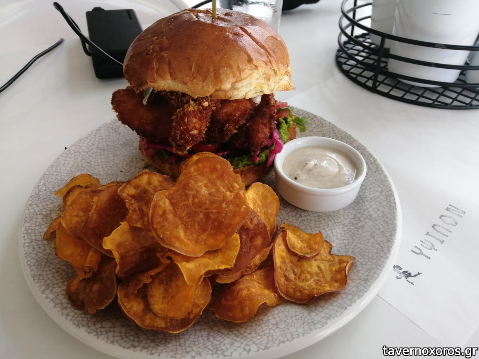 "Y.F.C. bun": με τηγανητό κοτόπουλο, σπιτικές πίκλες, γκουακαμόλε (το ψωμάκι υπερμπαγιάτικο-χαλούσε όλο το αποτέλεσμα, τα τσιπς αίσχος)