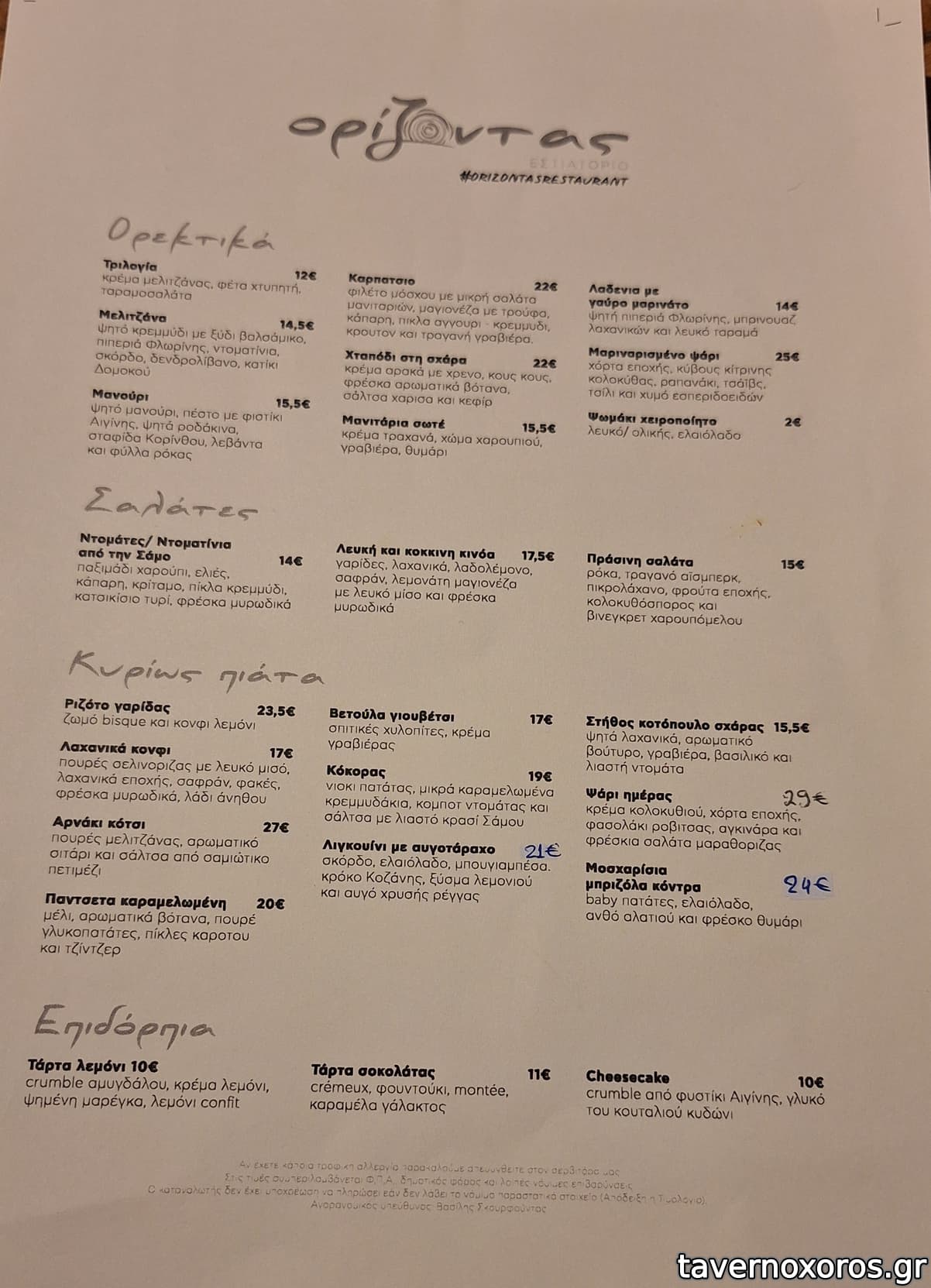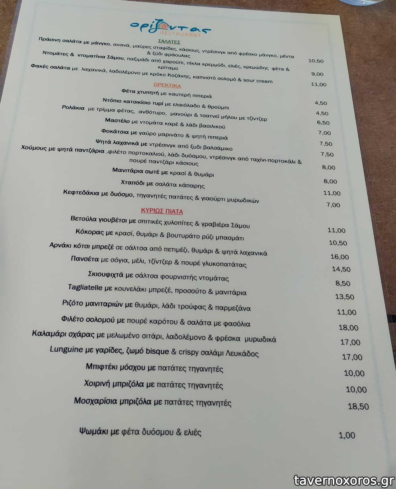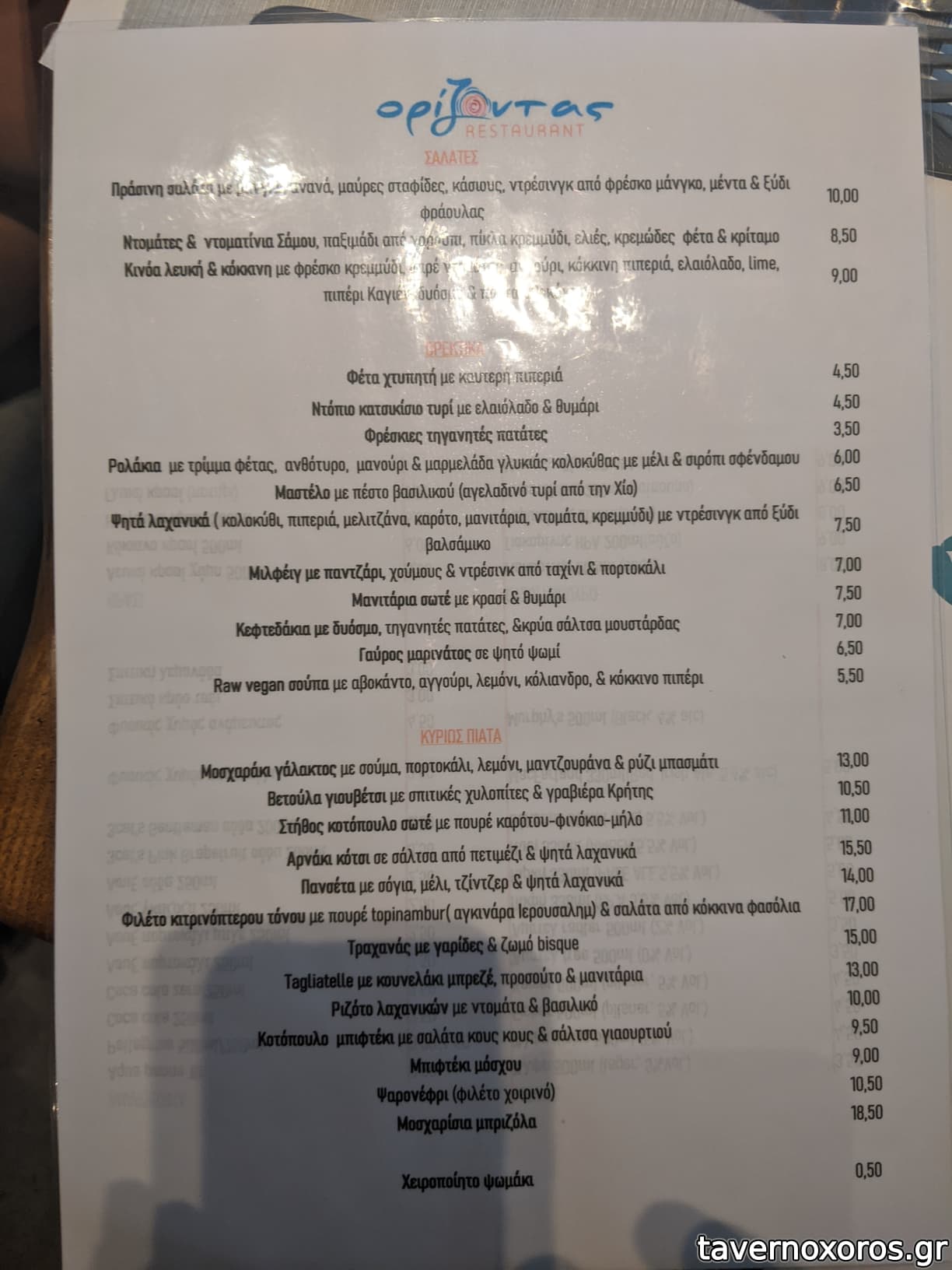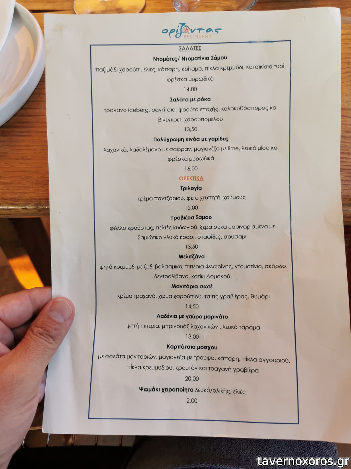 Ο Ορίζοντας είναι ένα εστιατόριο ψηλά σε ένα σημείο, που έχει θέα και στον βορρά και στον νότο της Σάμου- φοβερή θέα! Διαρρύθμιση νεο-εστιατορίου, με την κουζίνα στη μέση και φανερό το μαγείρεμα, και πιάτα εξεζητημένα. Ο Άγγελος κι ο αδερφός του είναι βασικοί υπεύθυνοι, ο ίδιος έρχεται στο τραπέζι και παίρνει παραγγελία. Τη μέρα που πήγαμε βέβαια είχαν 2-3 πιάτα στο μοτίβο κρέας+ζυμαρικό (μοσχάρι+ταλιατέλες, γίδα+κάτι άλλο..), αλλά ό,