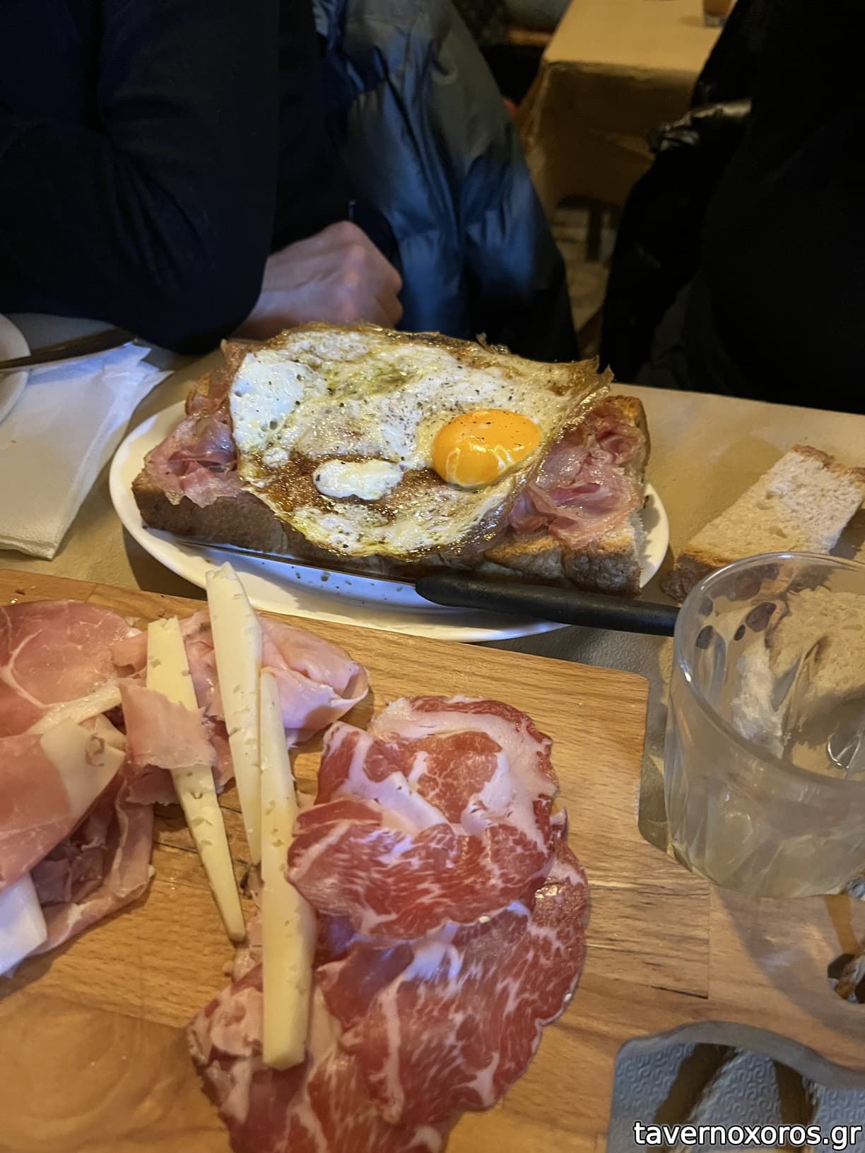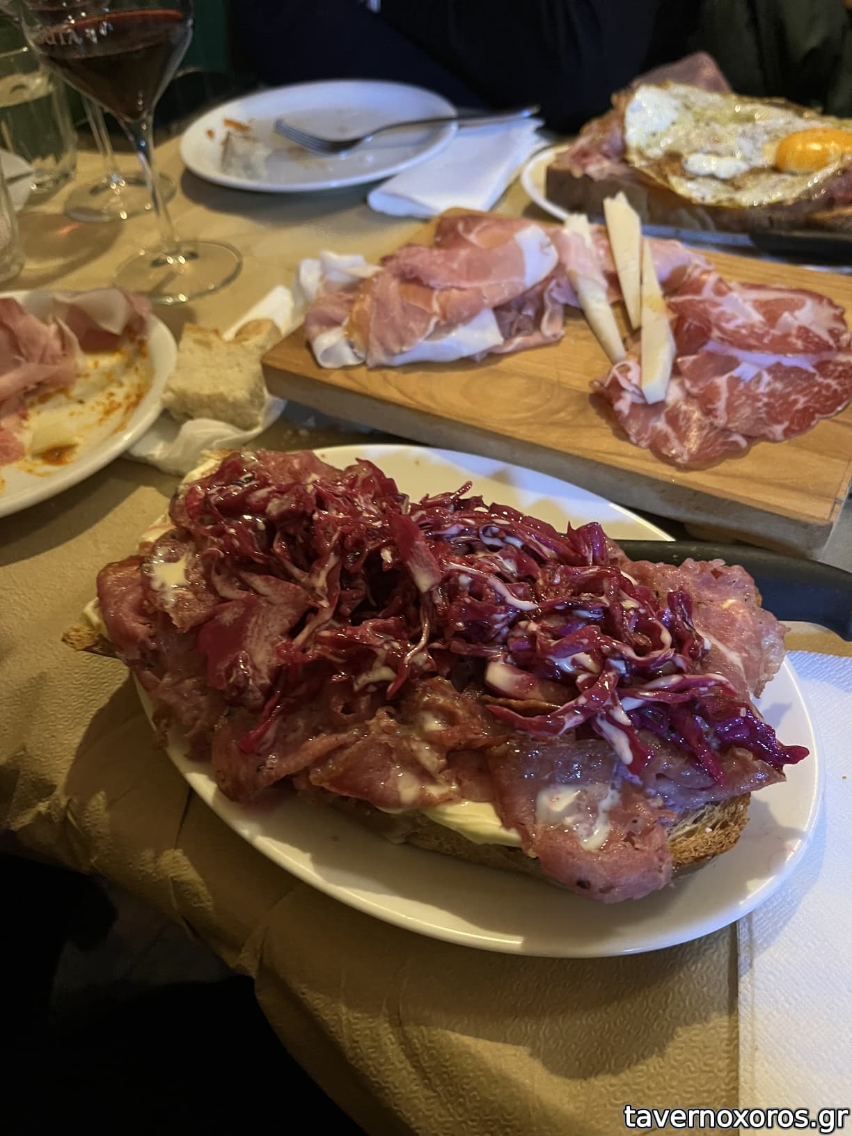 - Μπρουσκέτα με τηγανιτό προσούτο (άρρωστο), καραμελωμένα κρεμμύδια και αυγό: Εξαιρετική.