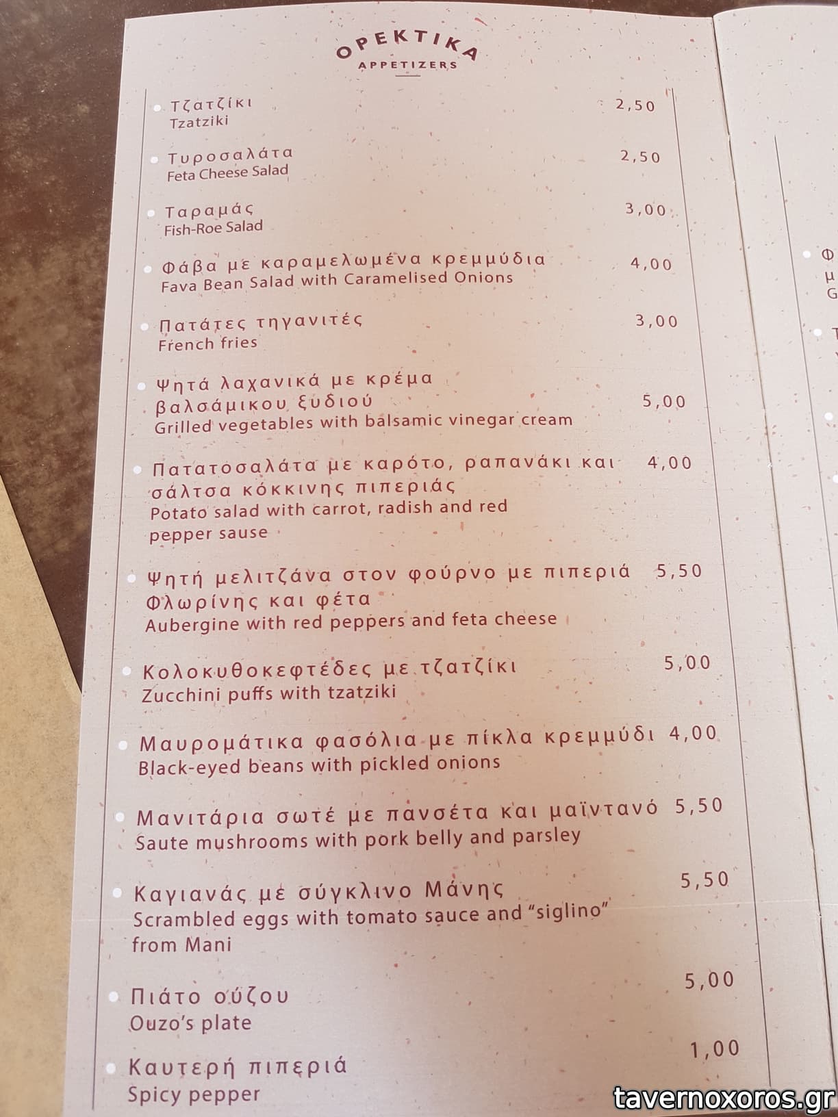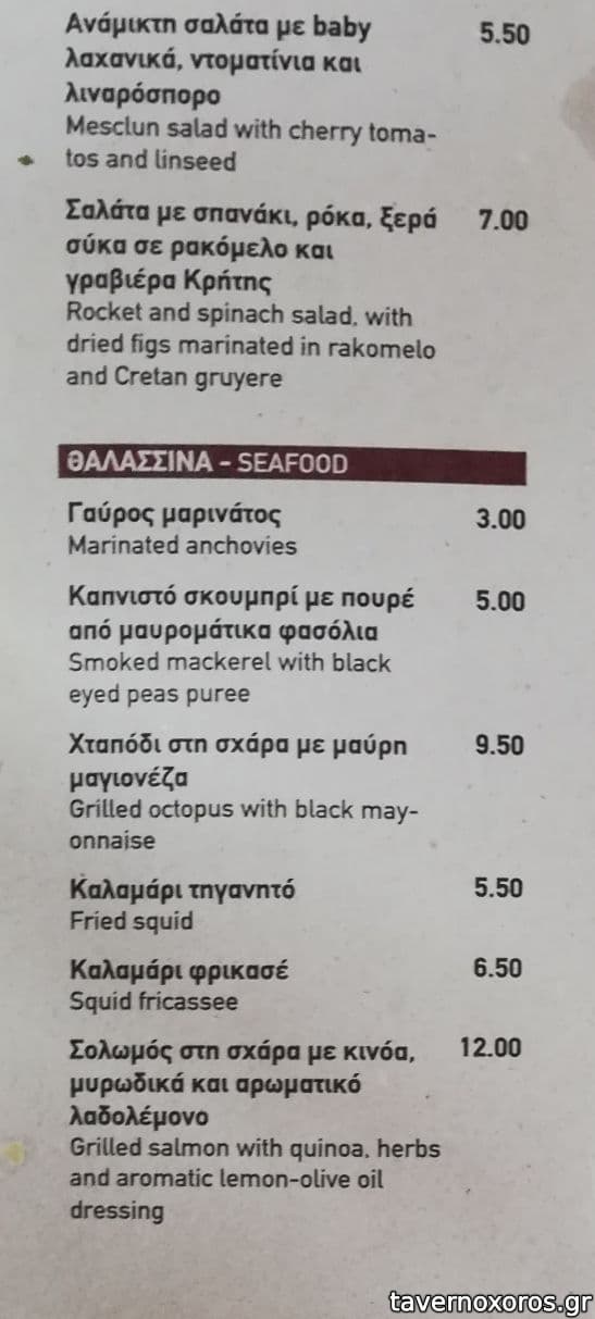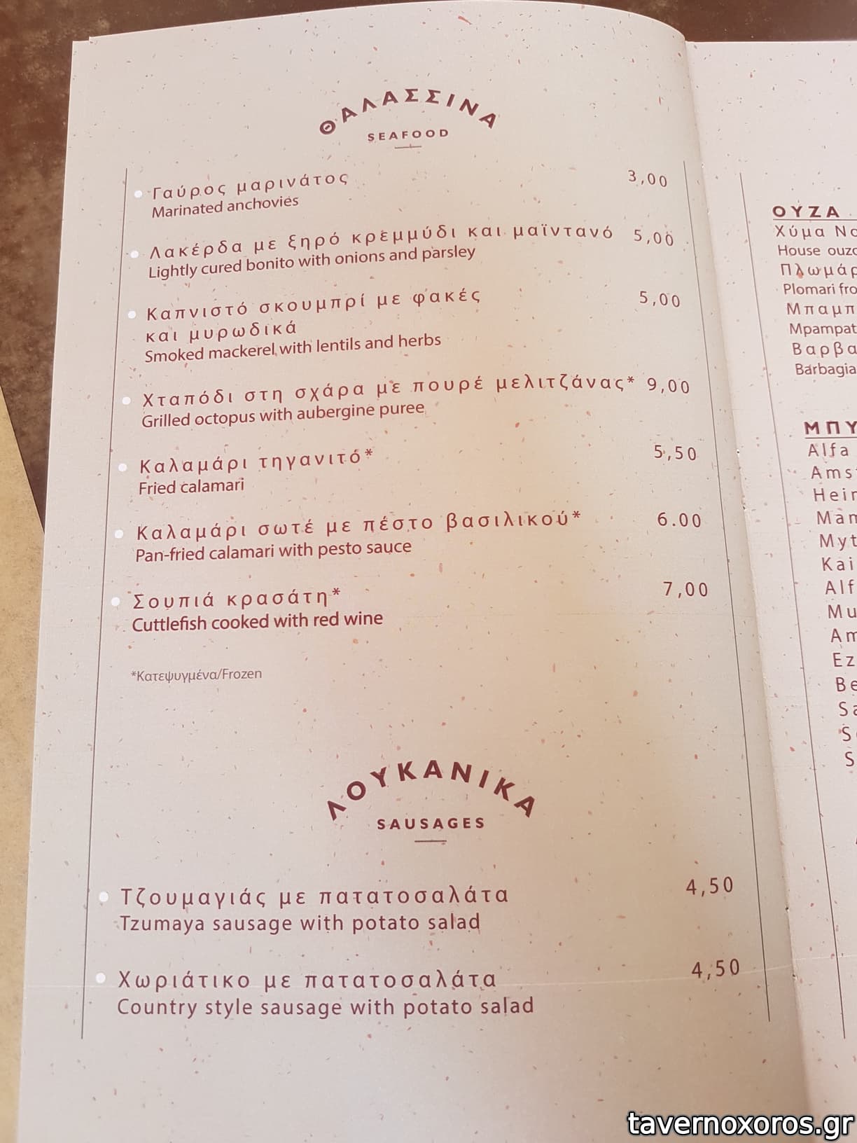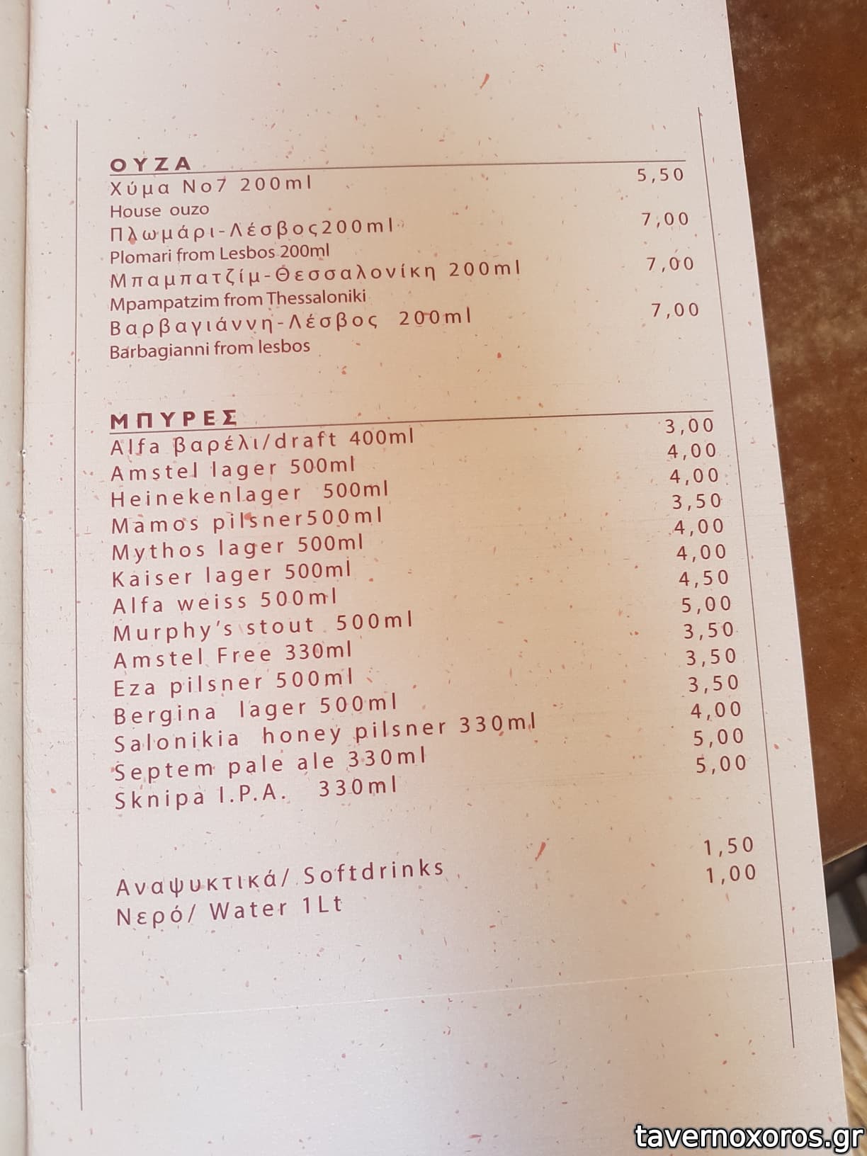 Δοκιμάστηκαν πατάτες τηγανητές (οκ), τυροκαυτερή (πολύ κακή, γεύση σαν μαγιονέζα), χωριάτικη (το τυρί δεν ήταν φέτα), μπιφτεκάκια σχάρας (αδιάφορα) και τηγανιά χοιρινή (οκ). Τα παραπάνω με 2 μπύρες περίπου 45€.