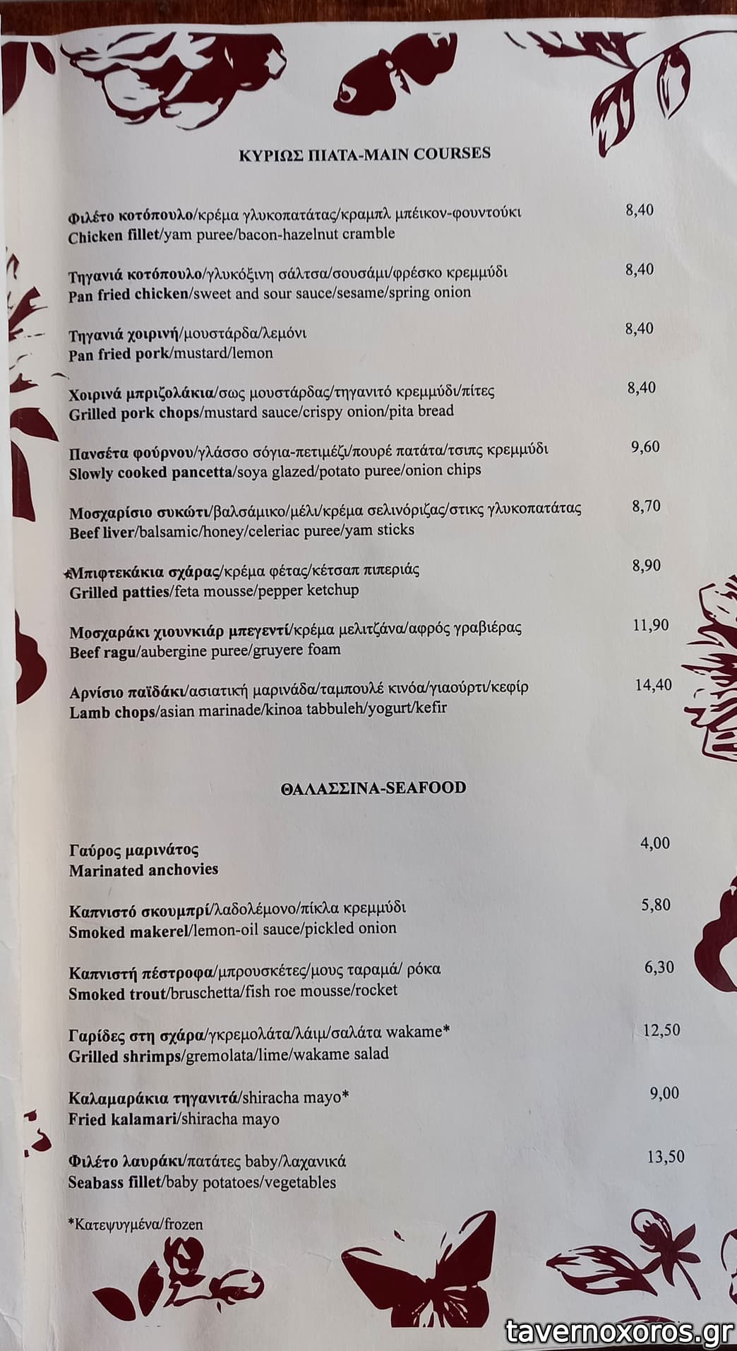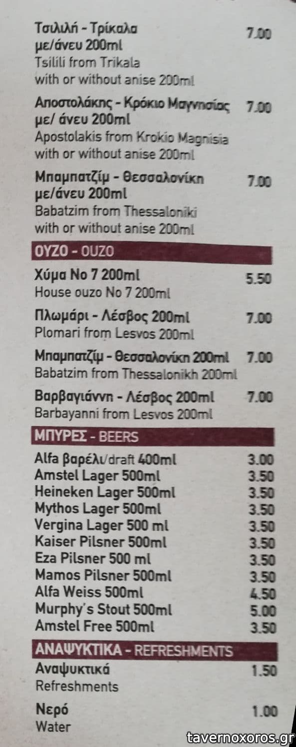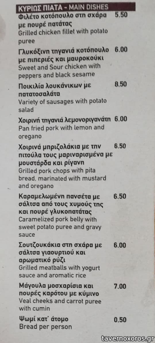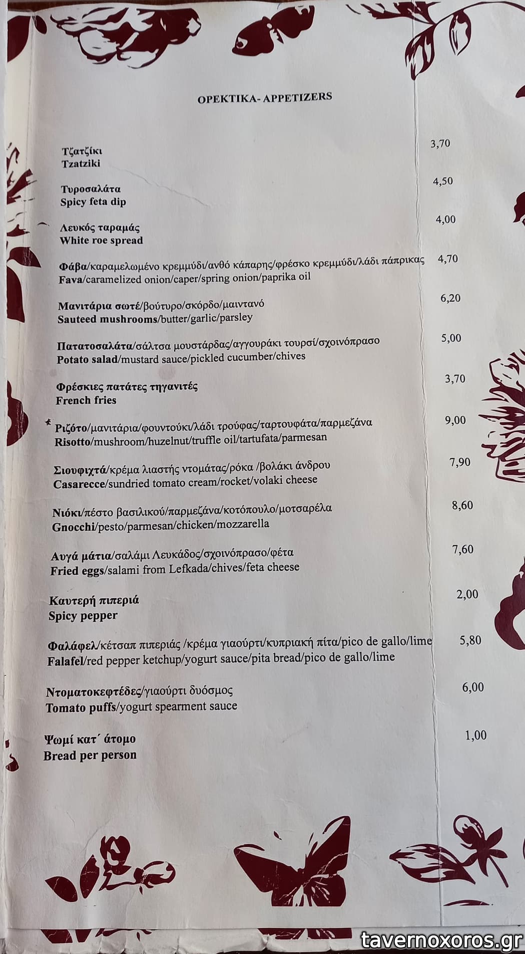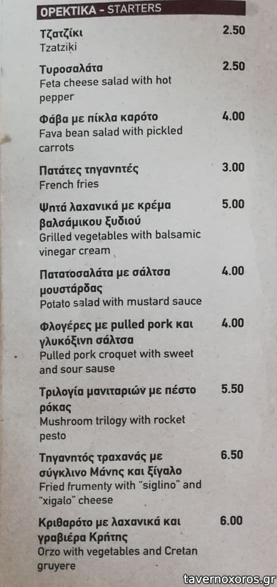 Δοκιμάστηκαν πατάτες τηγανητές (οκ), τυροκαυτερή (πολύ κακή, γεύση σαν μαγιονέζα), χωριάτικη (το τυρί δεν ήταν φέτα), μπιφτεκάκια σχάρας (αδιάφορα) και τηγανιά χοιρινή (οκ). Τα παραπάνω με 2 μπύρες περίπου 45€.