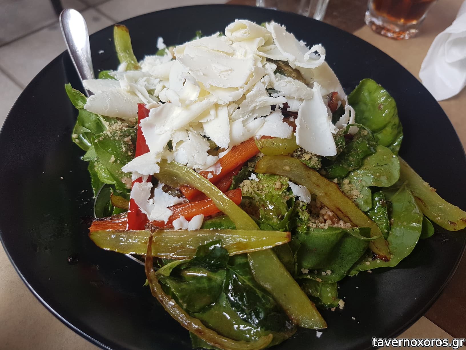 "Ρόκα με ψητές πιπεριές, καρύδι, ξηρό ανθότυρο Κρήτης και λαδολέμονο" (οκ)