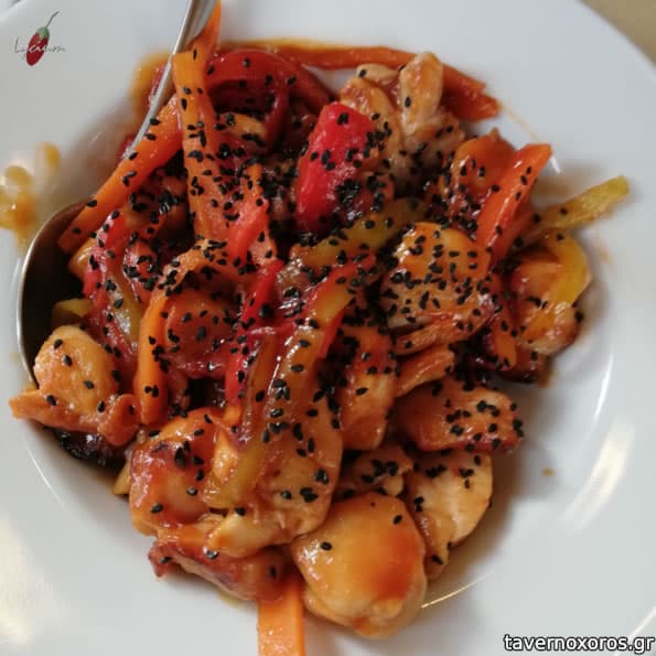 "Γλυκόξινη τηγανιά κοτόπουλο" (πολύ καλή)