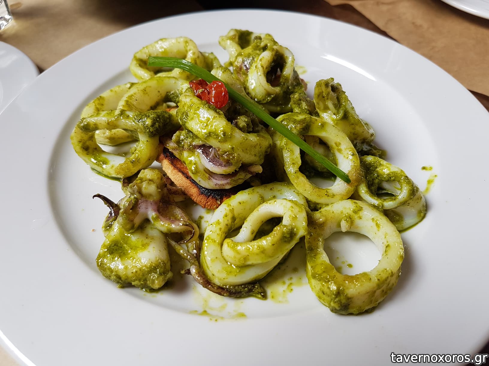 "Καλαμάρι σωτέ με πέστο βασιλικού" (το καλαμάρι άψητο, η σως καλή)