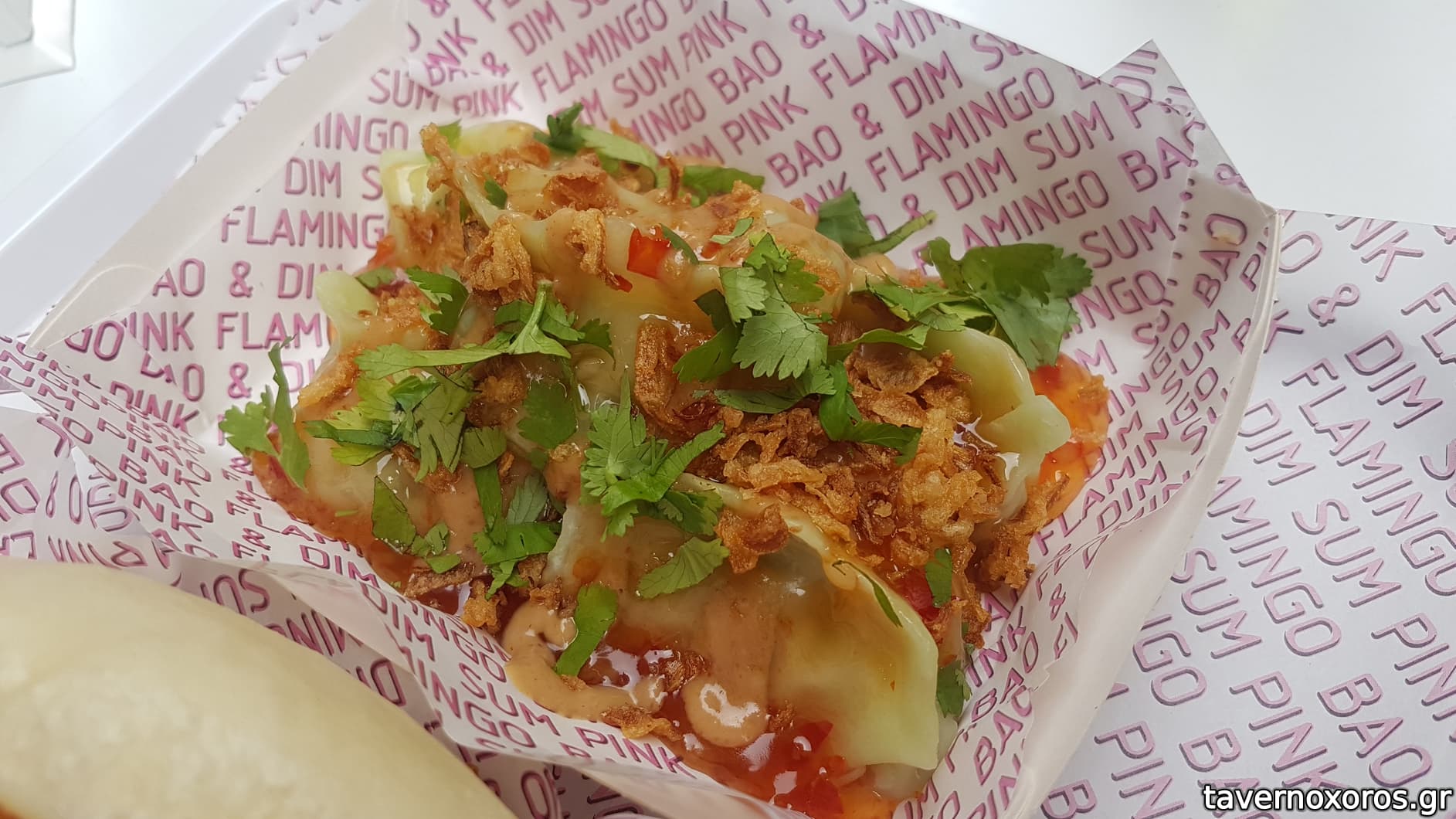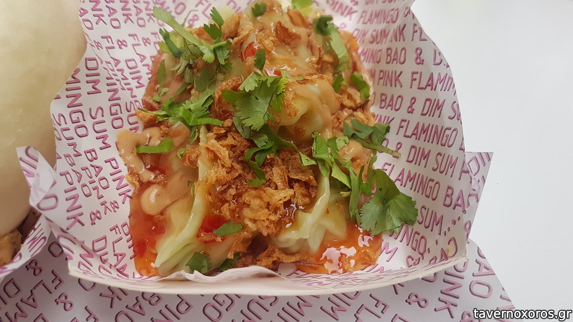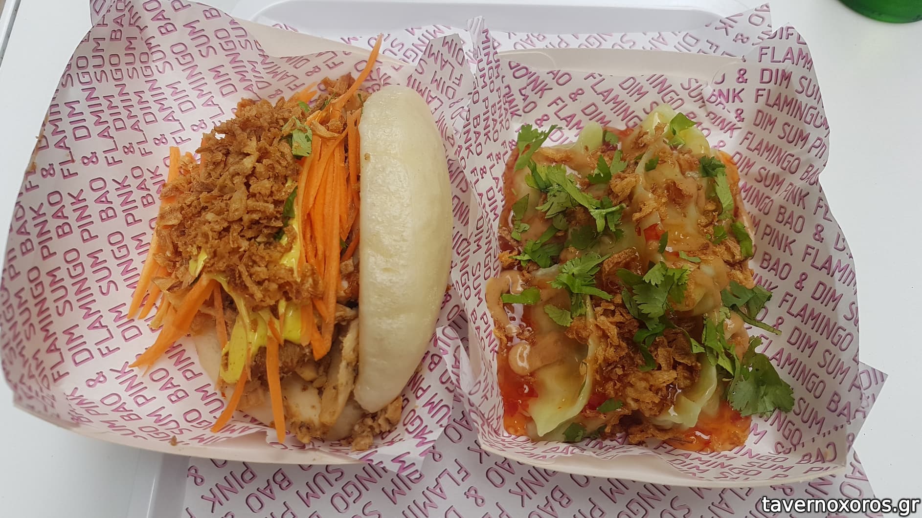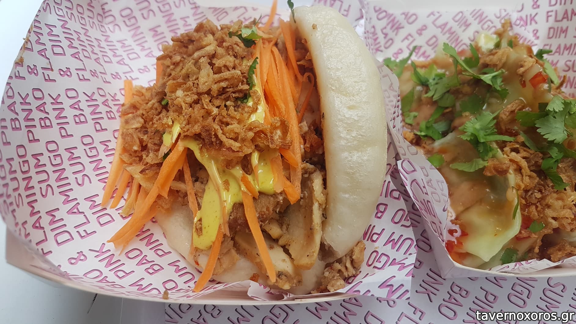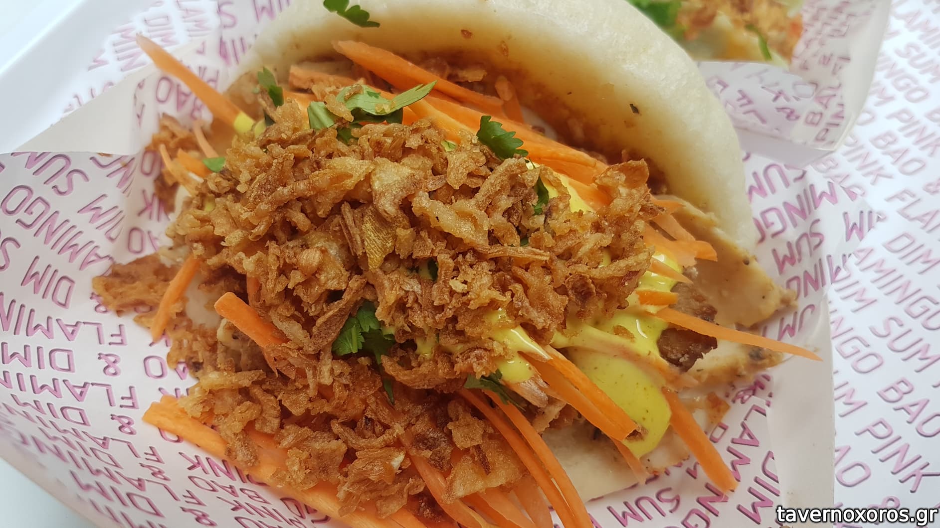 Bao "ψητό χοιρινό, hoisin sauce, curry mayo, λαχανικά, crispy onions" (καλό)